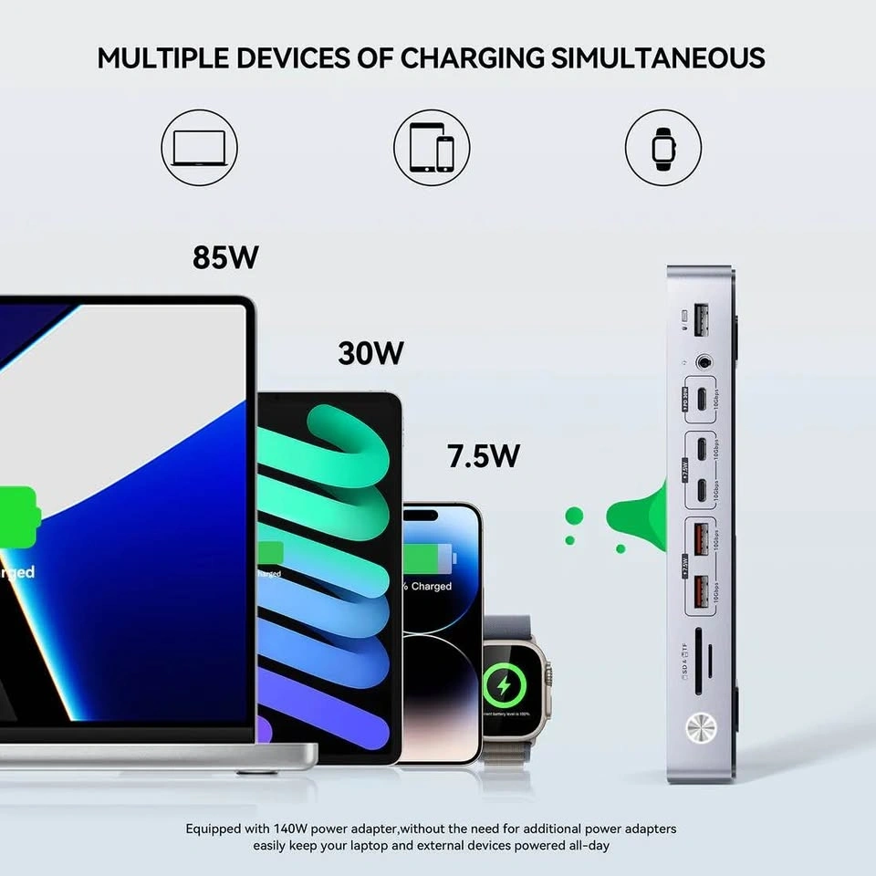 Great docking station for a powerful, clean multi-monitor setup. Supports up to 3 monitors (HDMI + DisplayPort, up to 4K/8K). Works with Mac M1/M2/M3 and Windows using DisplayLink. 140W power adapter included (up to 85W charging for your laptop). 16 ports total: USB-C (10Gbps + 30W charging), multiple USB-A, Ethernet, SD/TF, audio. Fast data transfer + charge your phone/tablet at the same time. Perfect for productivity, coding, or research setups—just plug in one cable and you’re good to go. Everything included and working great.