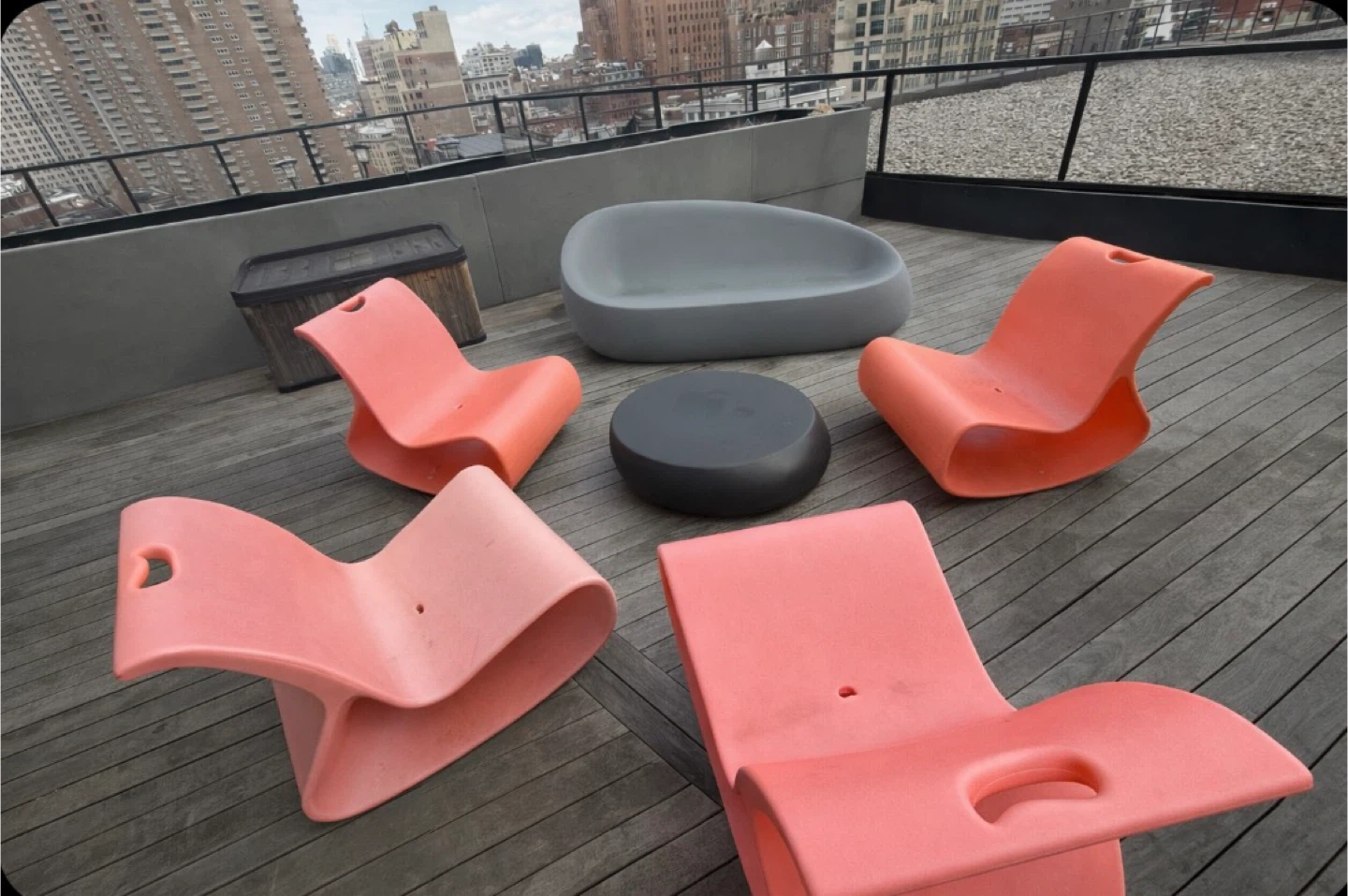 • Four sculptural orange lounge chairs (intentionally mismatched tones — design, not defect 😉)