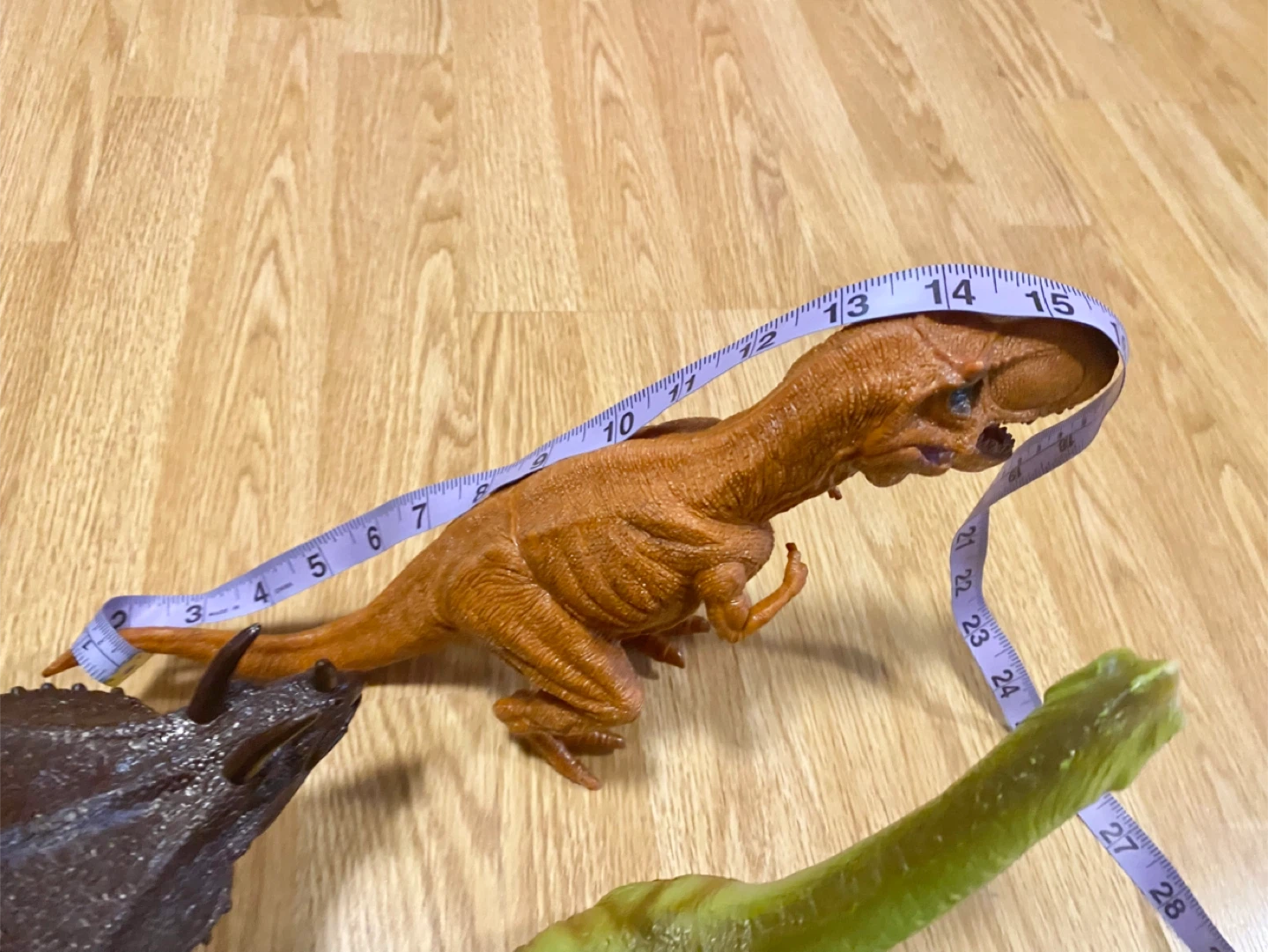 A T-Rex, Triceratops, Brachiosaurus, Stegosaurus, and a smaller dinosaur figure.