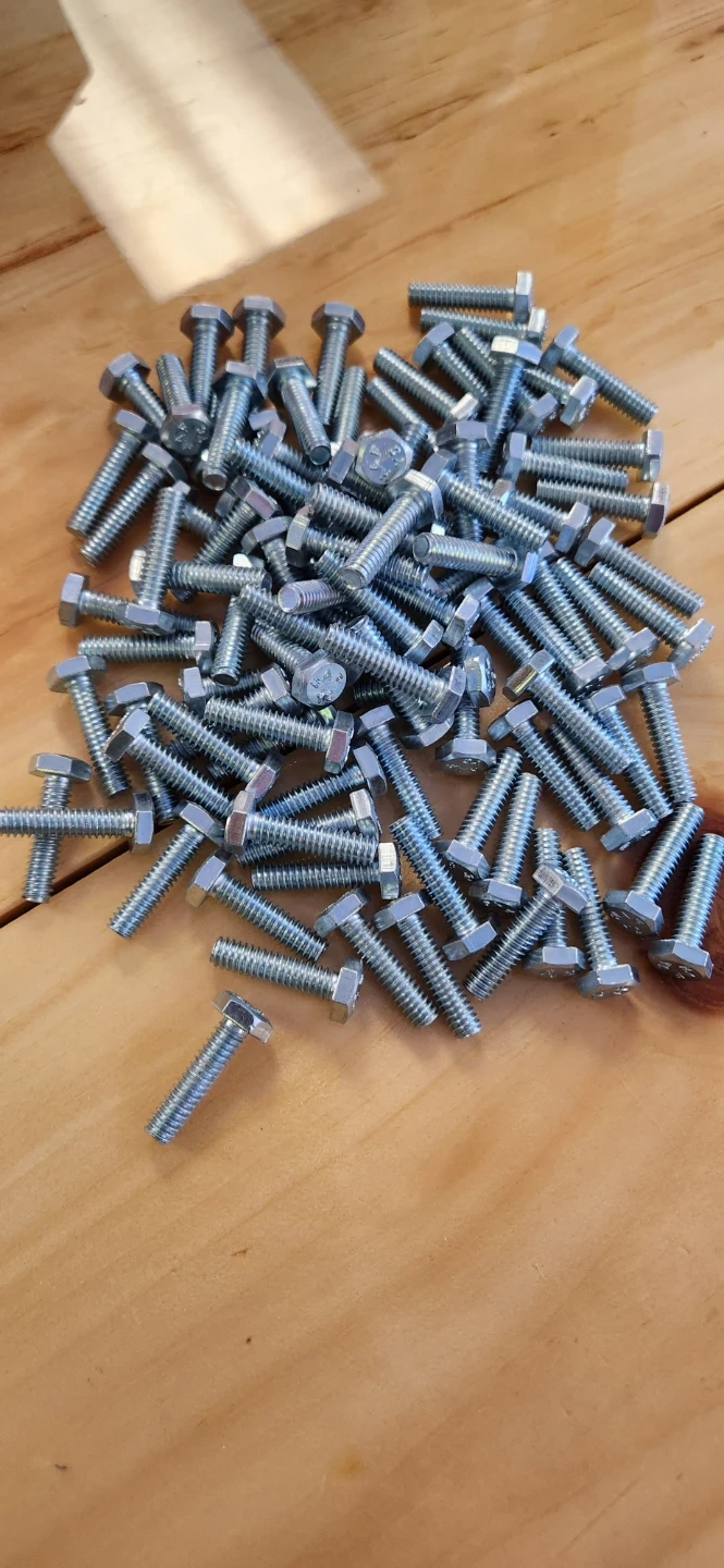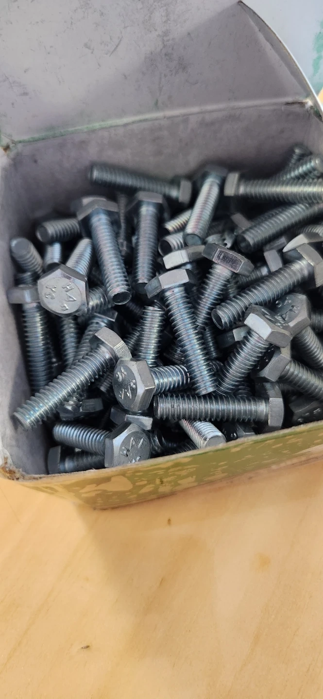 Lots of hex bolts, perfect for any project. They're made of steel with a zinc plating for durability. Comes in a box, ready to use! 1/4 Inch 7/16 wrench
