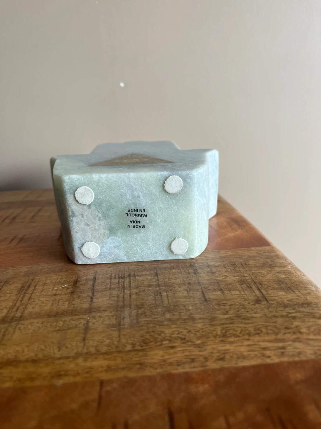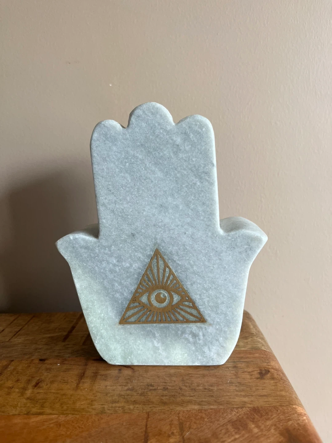 Decorative Hamsa hand made from marble. Features a gold-tone Eye of Providence design. Made in India. It's a unique piece for home decor.