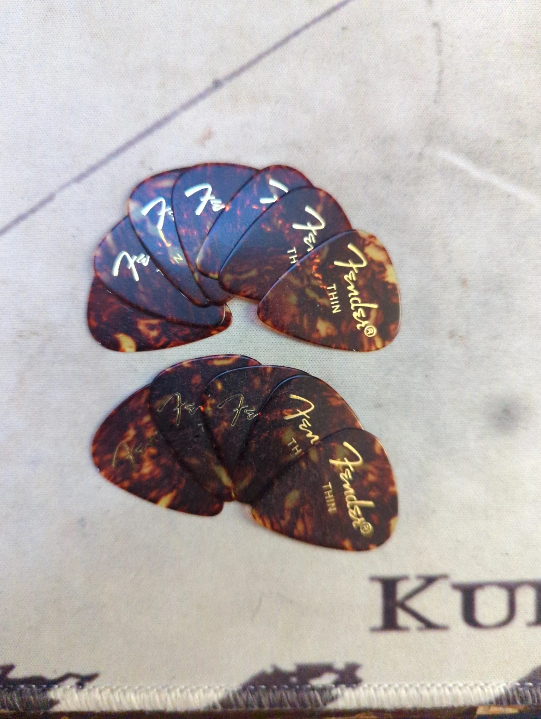 Selling a pack of 12 of Fender thin guitar picks! They're the classic tortoise shell colour. Perfect for any guitarist looking for a reliable and versatile pick