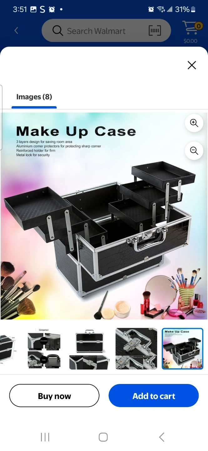 This is a black make-up case with a 3-layer design for saving space. It's built with aluminium corner protectors and a reinforced holder for durability. The metal lock ensures security for your belongings.