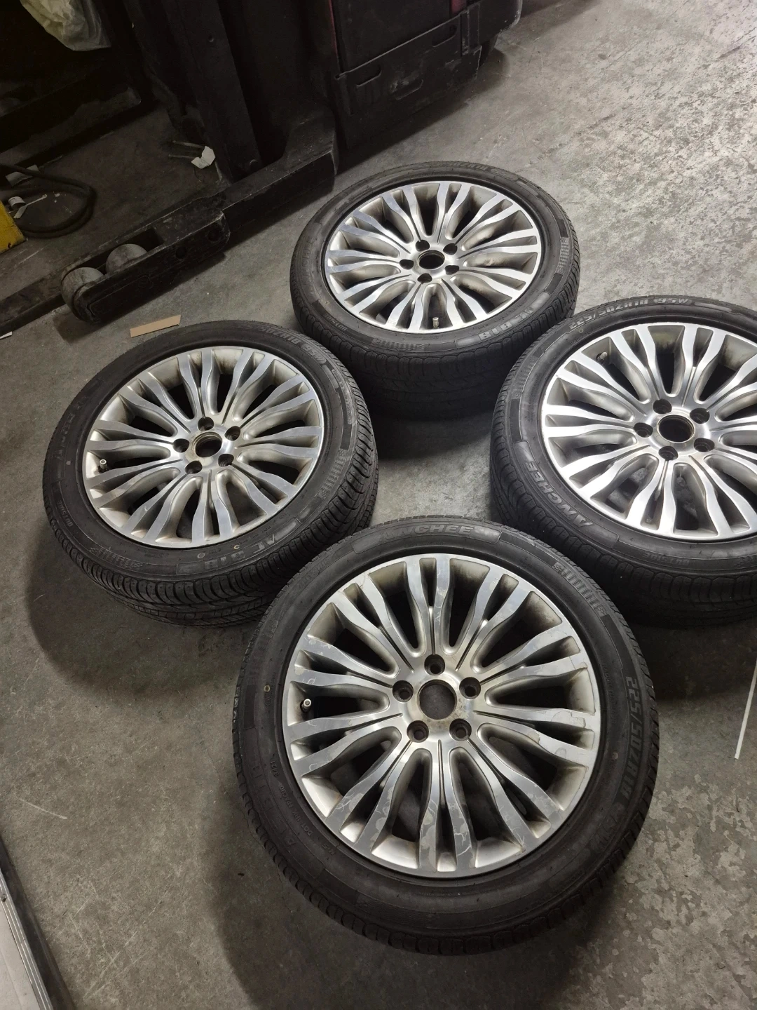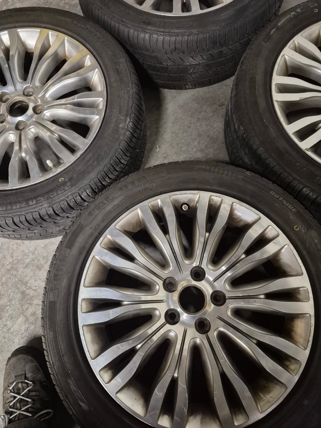 Set of four used tires mounted on alloy rims. Rims have a silver finish and a multi-spoke design. Tires are 80% tread rims are very good condition no dents.bolt pattern 5x114.3