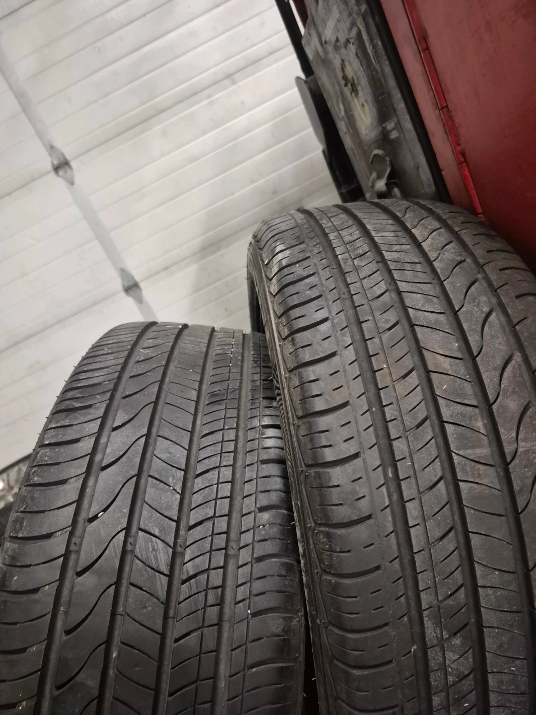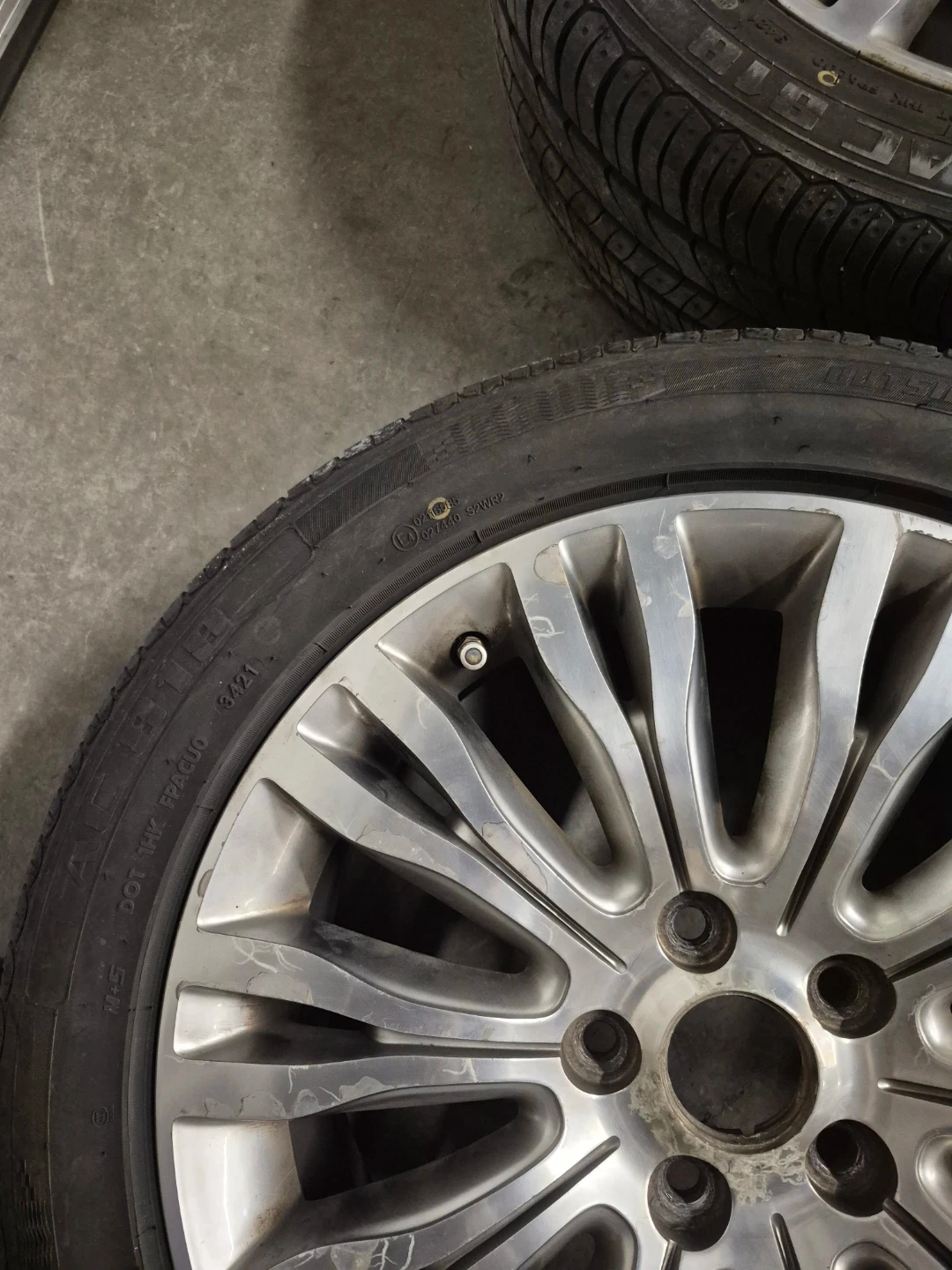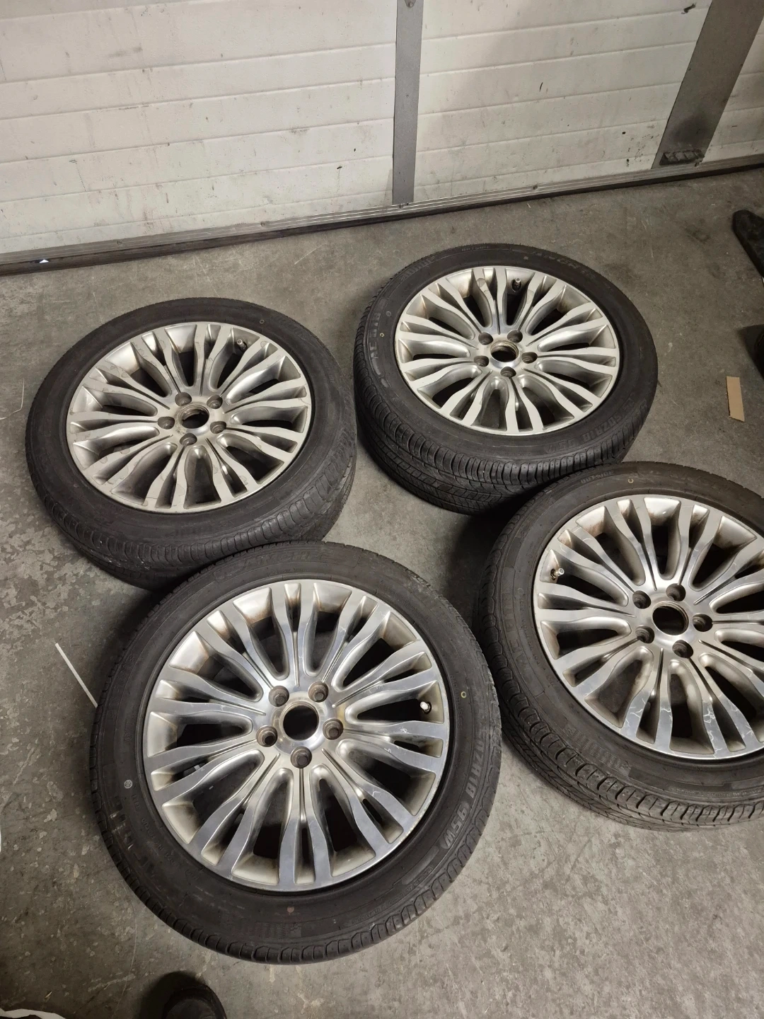 Set of four used tires mounted on alloy rims. Rims have a silver finish and a multi-spoke design. Tires are 80% tread rims are very good condition no dents.bolt pattern 5x114.3