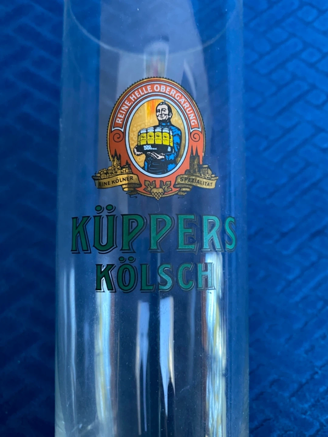 This is a clear glass with the Kuppers Kölsch logo printed on it. It's a tall, cylindrical glass suitable for serving beer. This glass would be great for enjoying a refreshing Kölsch! It's a nice addition to any beer enthusiast's collection.
