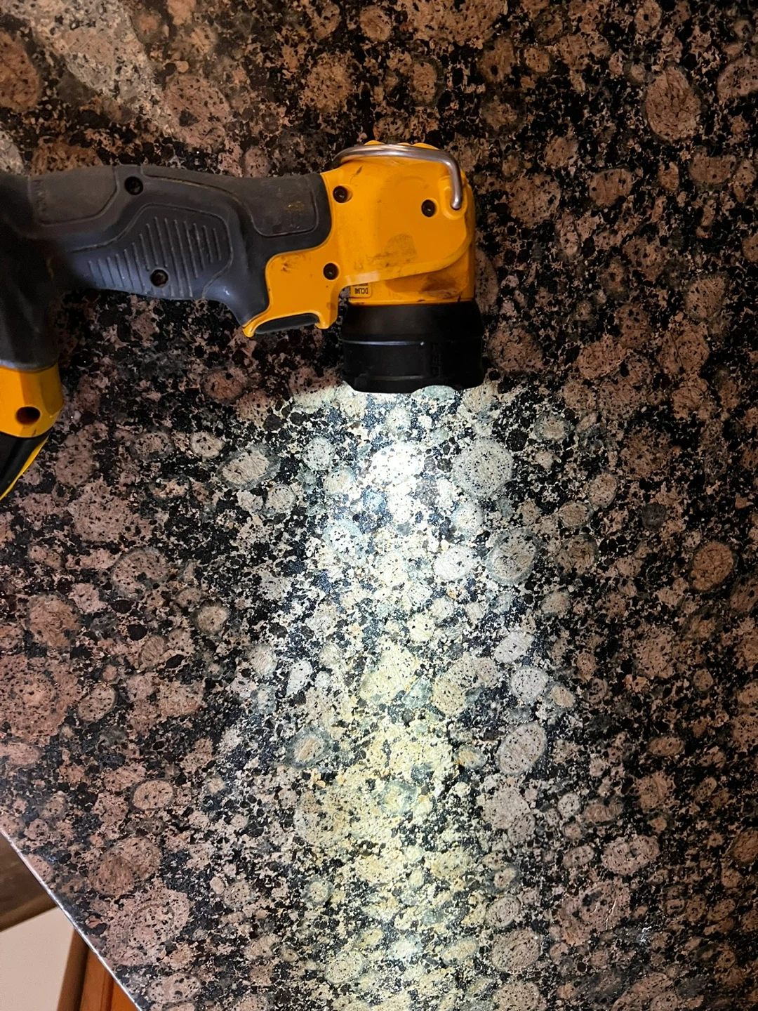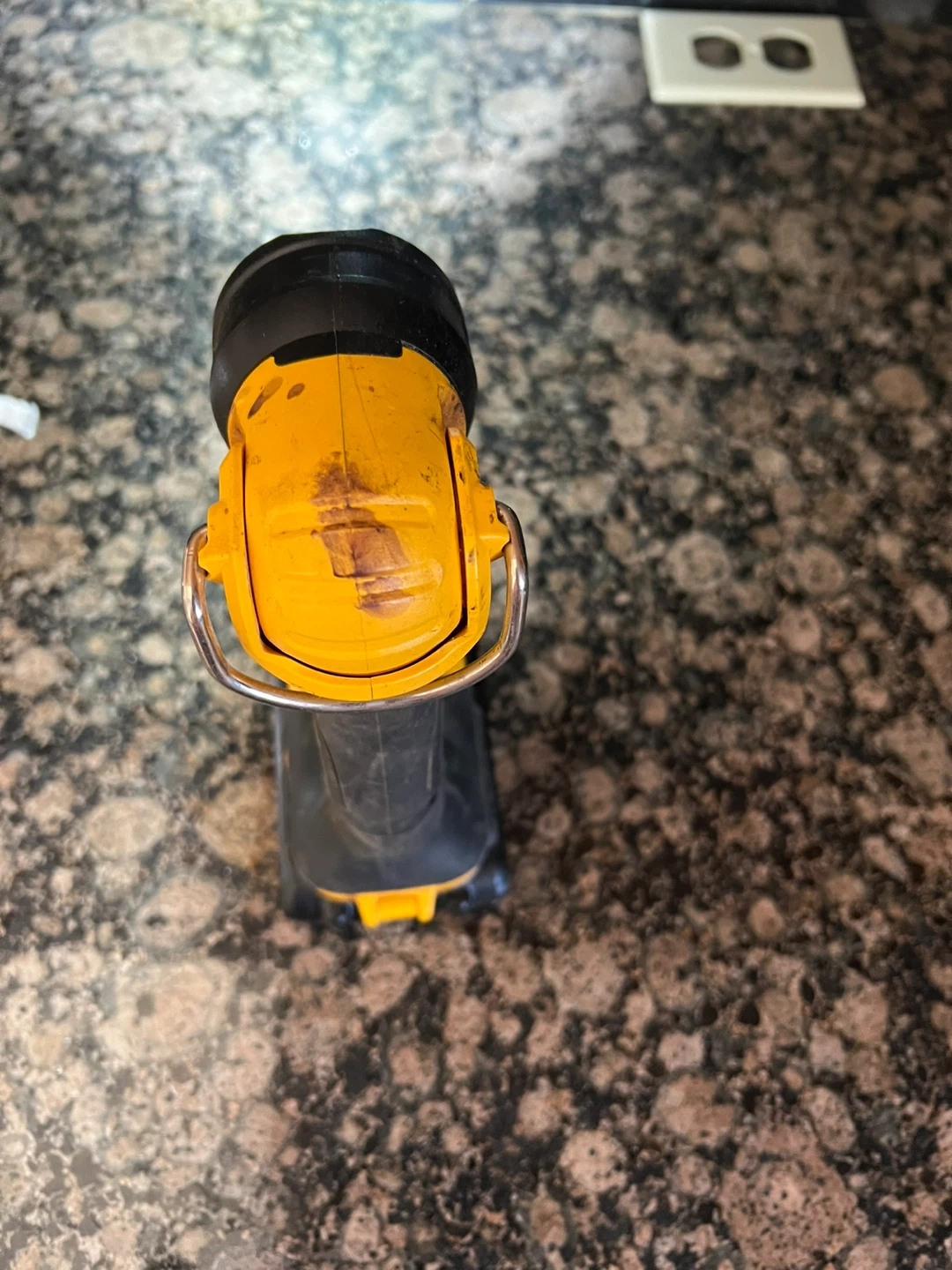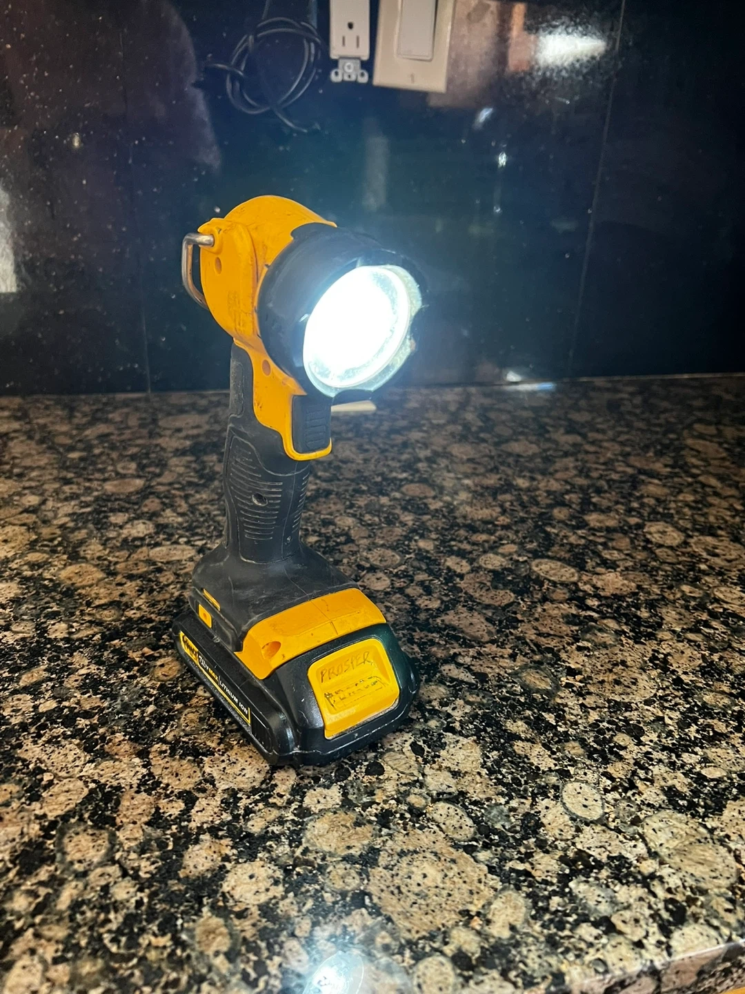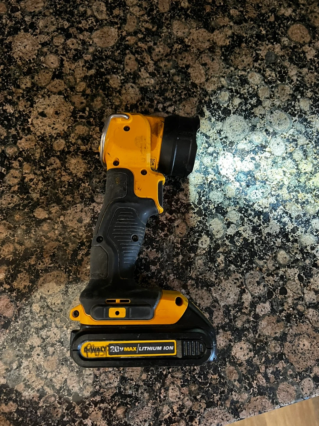 This is a DeWalt 20V MAX Lithium Ion work light. It's yellow and black with a pivoting head. This light is perfect for dark workspaces or power outages! Needs a battery