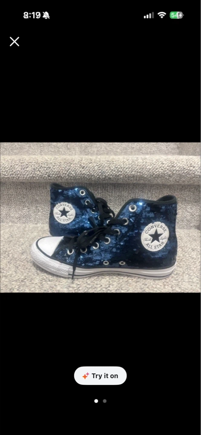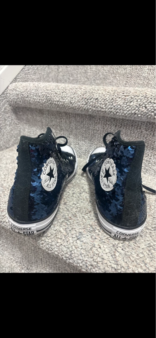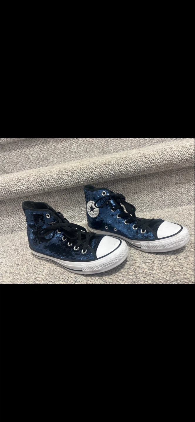 Sparkly blue sequin Converse high tops! These cool kicks have the classic white toe cap and rubber sole. They're perfect for adding some shimmer to any outfit. Size 7.5 pick up cash only