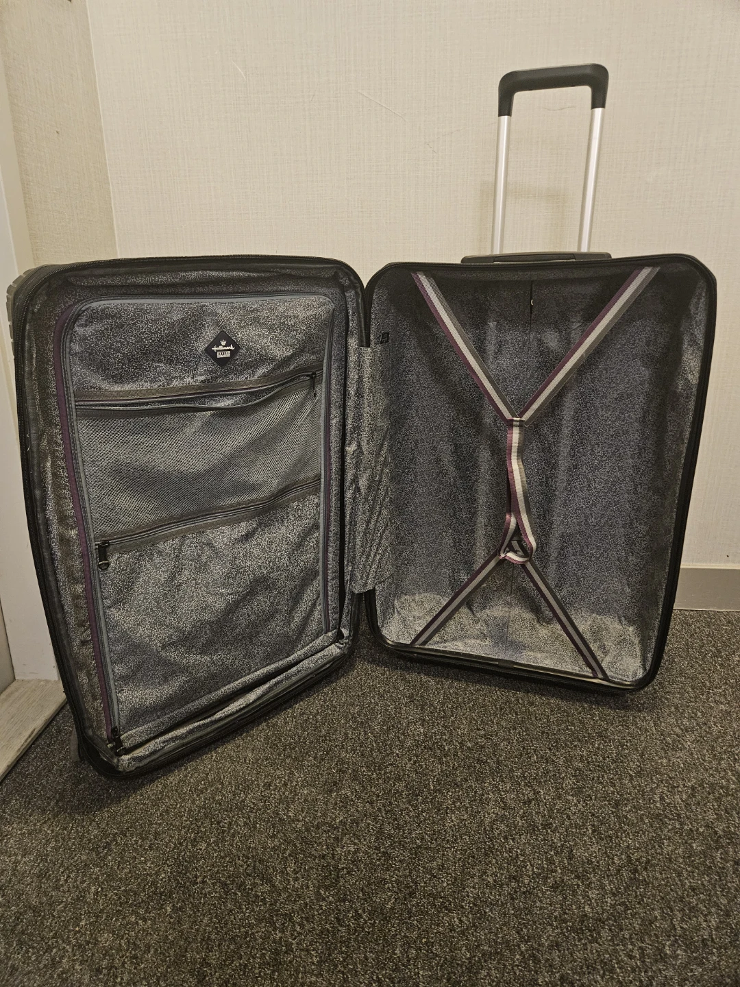 This is a Hallmark black Expandable, hardside spinner suitcase. It features a telescopic handle, TSA lock, and spinner wheels. The interior has zippered compartments and tie-down straps for organized packing.