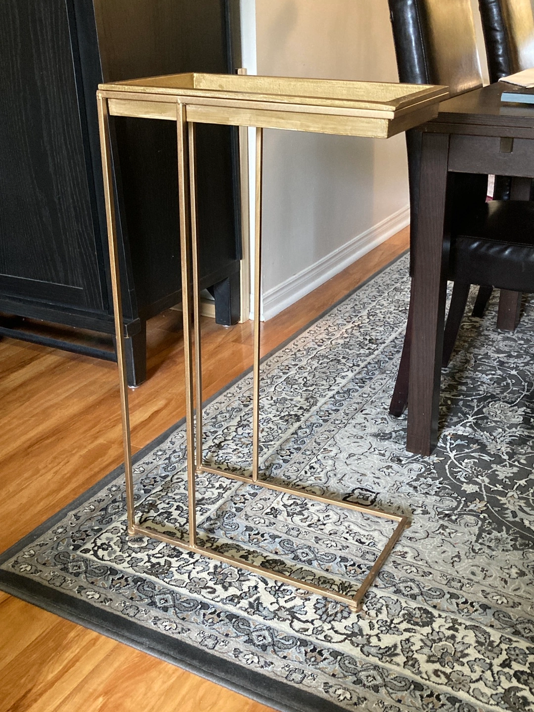 Selling a 47th & Main modern C-shaped side table with a gold metal base and a natural wood top! It's perfect as a laptop table in the living room, bedroom, or bathroom.