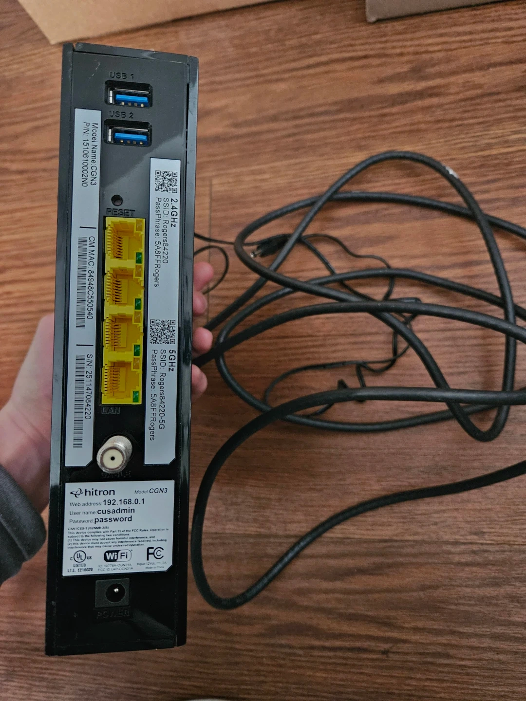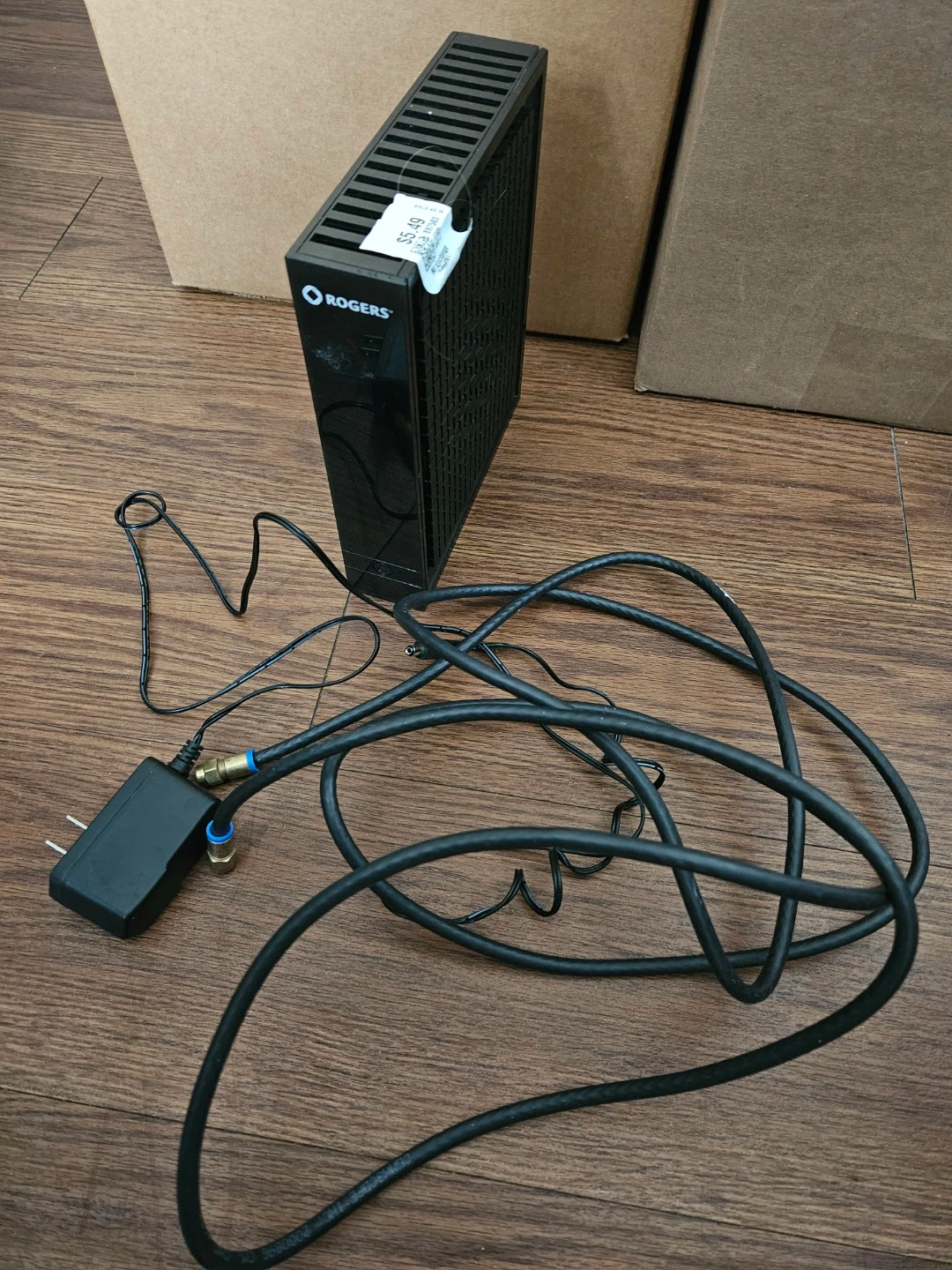 This Rogers Hitron CGN3 modem and router is a reliable networking device. It features multiple USB ports and a coaxial input for cable connection. Comes with power adapter and cables.