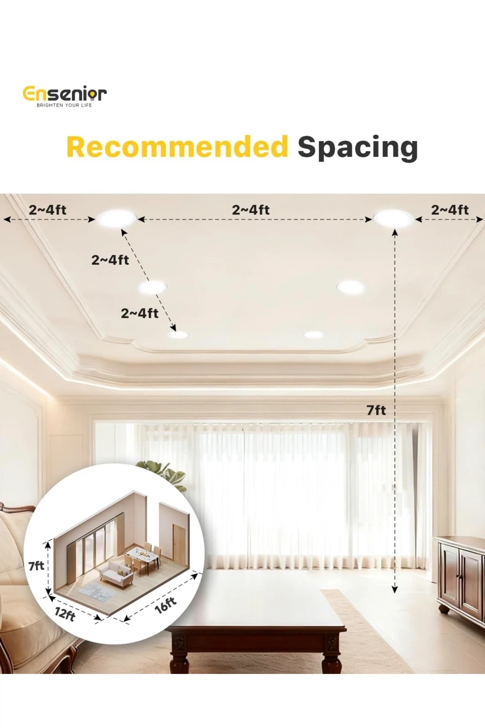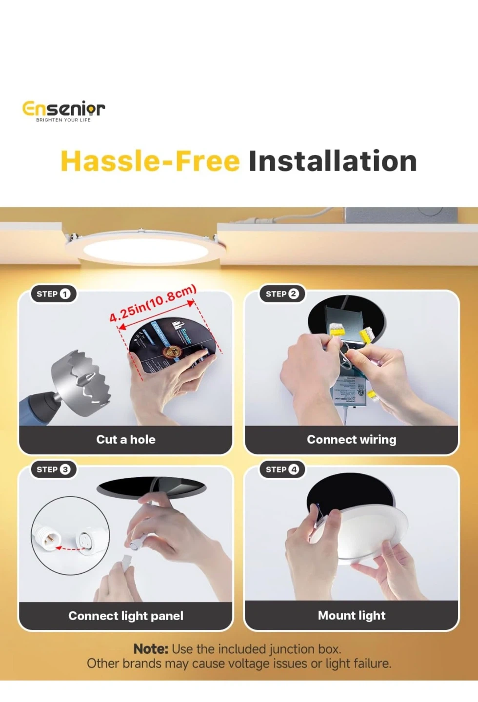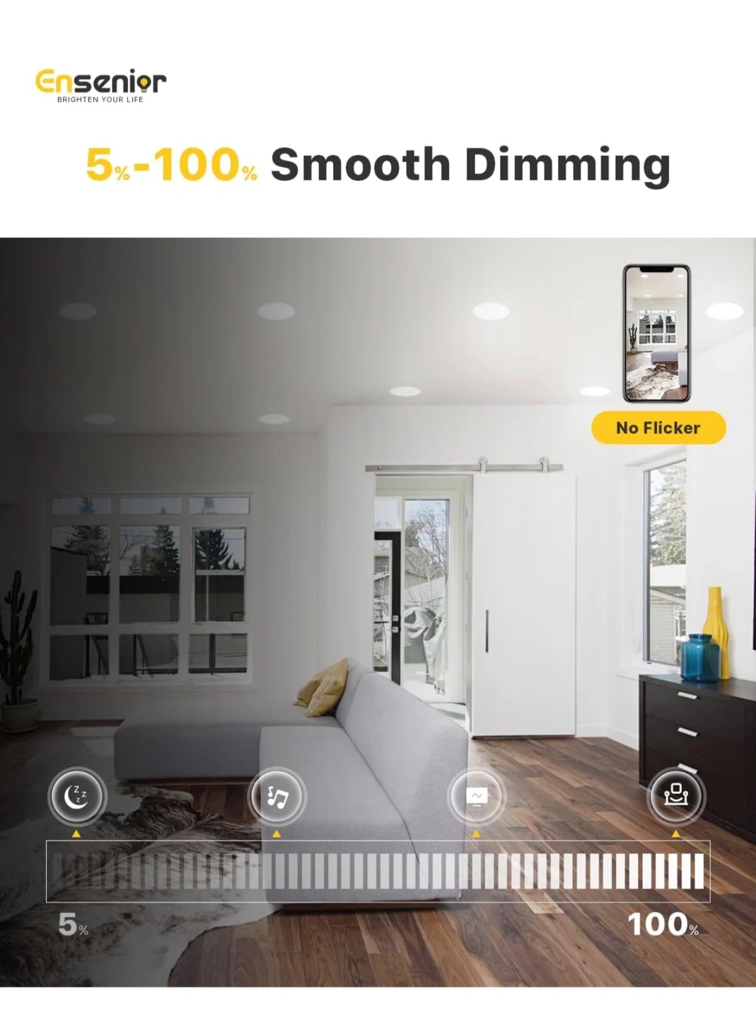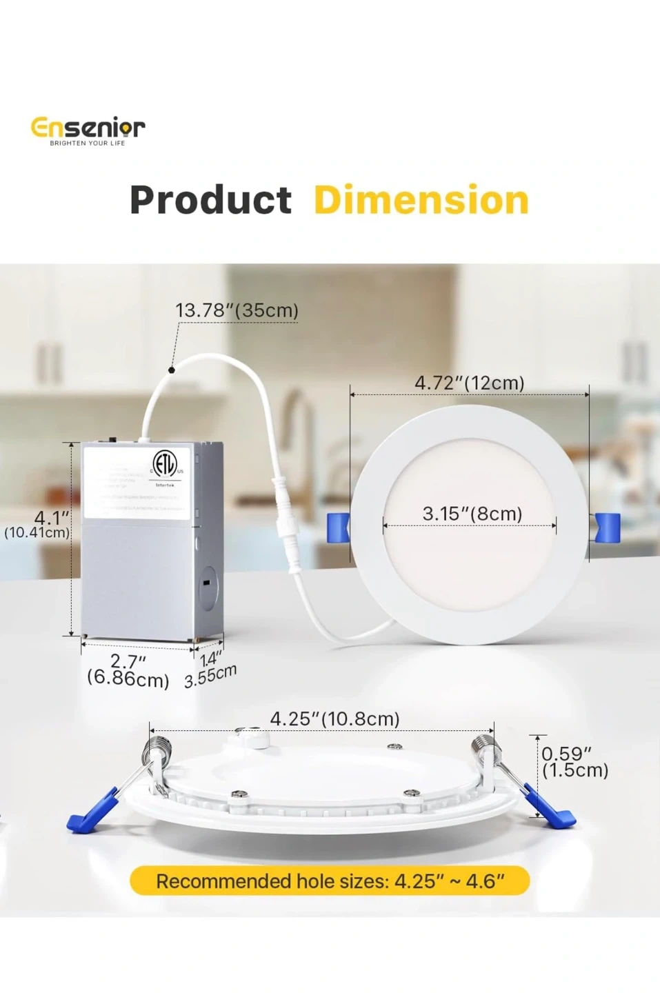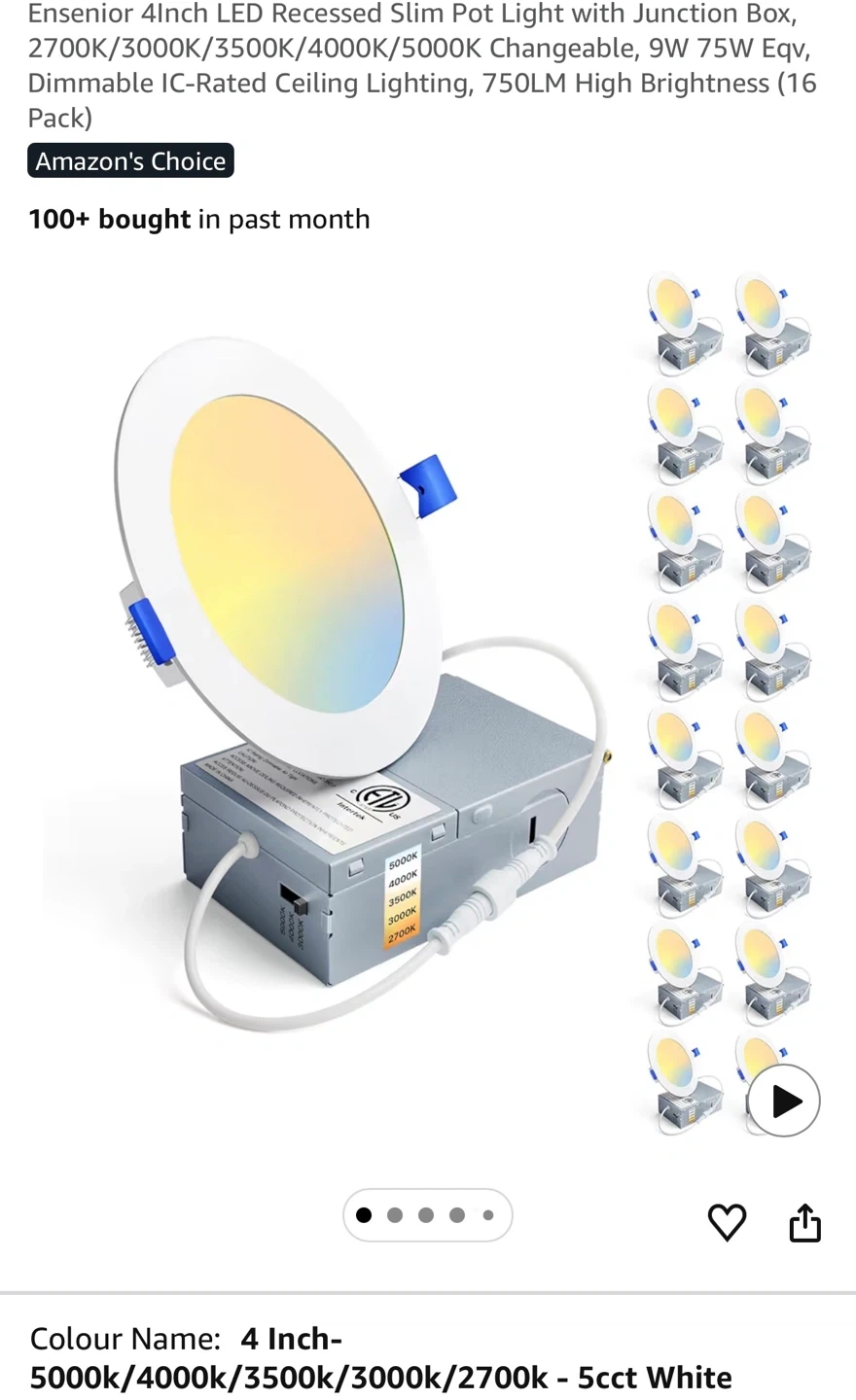 This Ensenior 4-inch LED recessed slim pot light offers high brightness at 750 LM and 9 watts. It's dimmable from 5-100% and suitable for damp locations. This light also features 5CCT color temperature changeability (2700K-5000K).