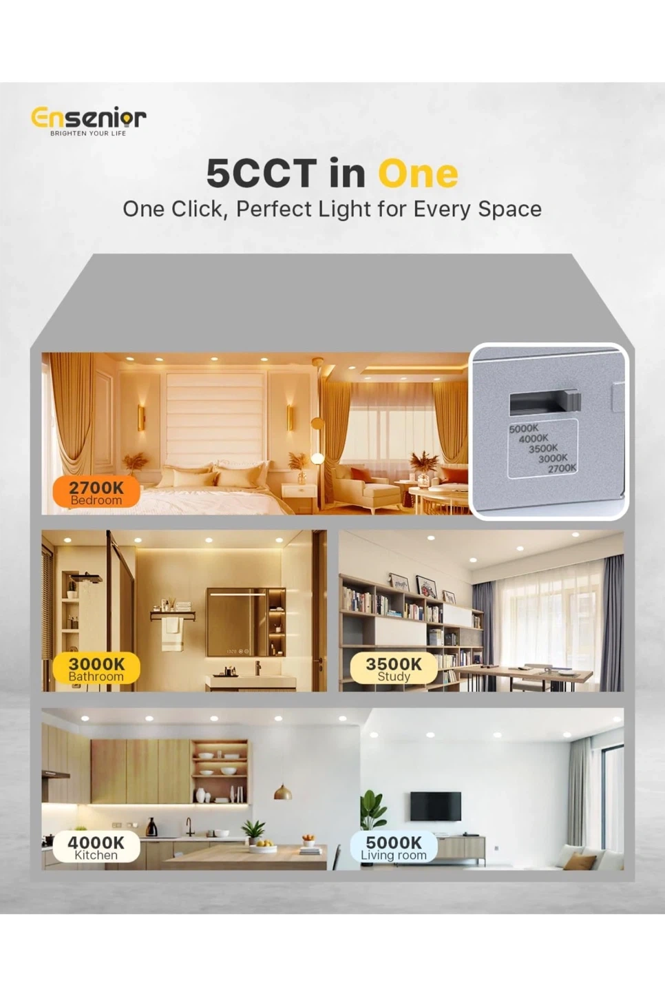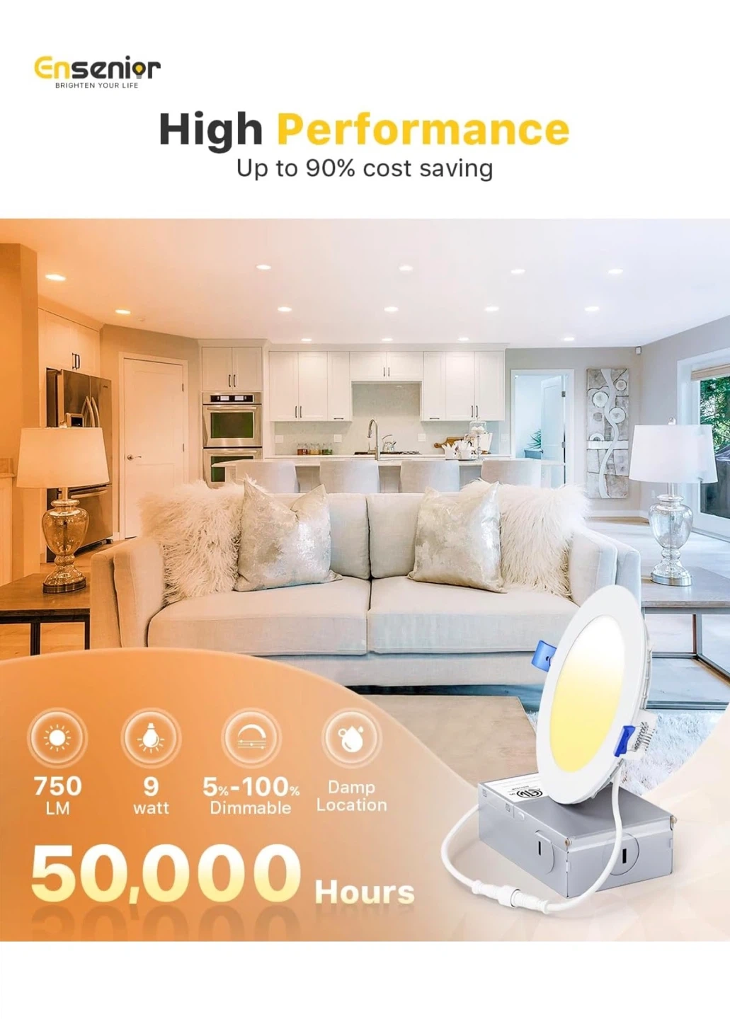 This Ensenior 4-inch LED recessed slim pot light offers high brightness at 750 LM and 9 watts. It's dimmable from 5-100% and suitable for damp locations. This light also features 5CCT color temperature changeability (2700K-5000K).