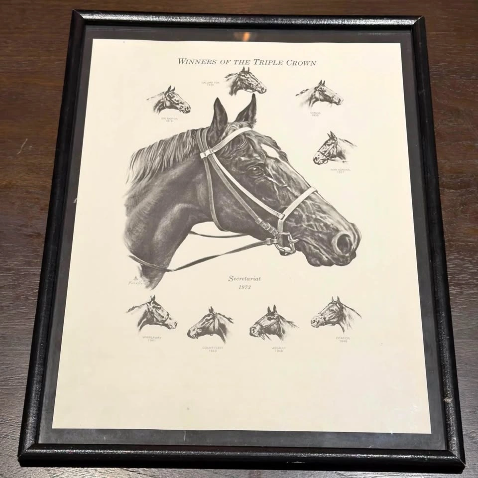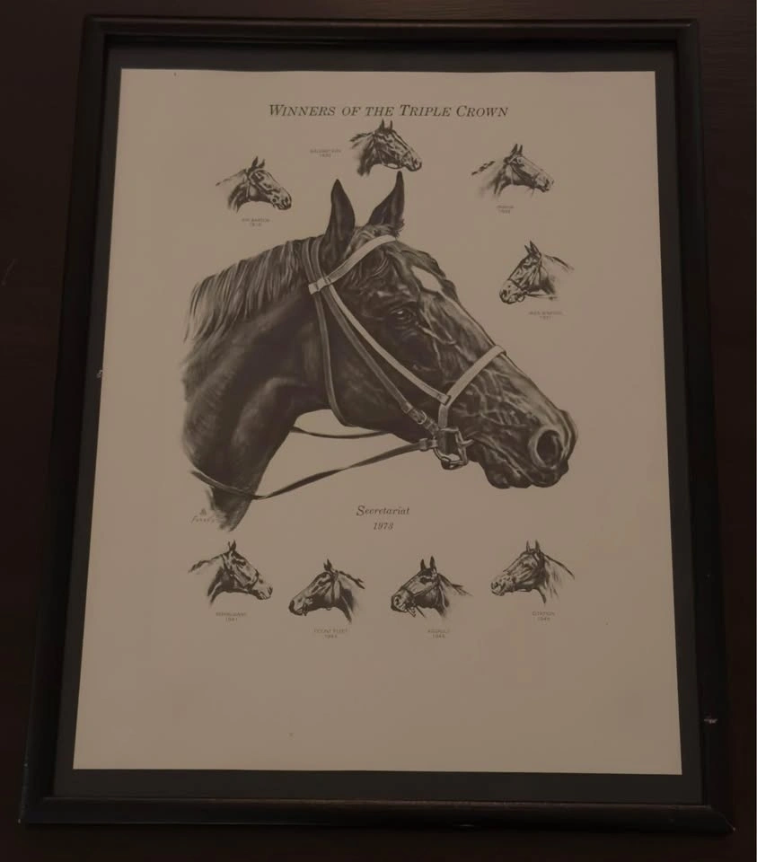 This artwork features artist ‘Stan Fenelle’ drawing of Secretariat and the only other eight (8) horses to ever win the Kentucky Derby, The Preakness, and the Belmont Stakes (Triple Crown).