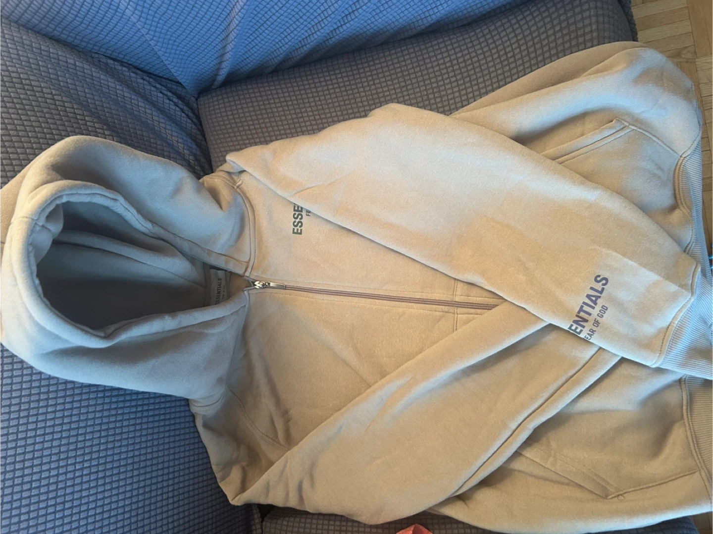 Selling an Essentials Fear of God full zip hoodie. It's a size medium and in great condition. The colour is a neutral, versatile tone. Perfect for layering or wearing on its own!