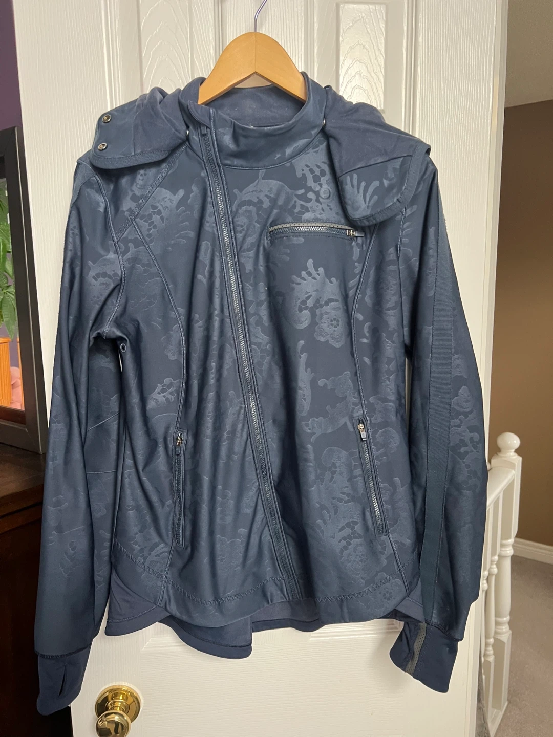 This Lululemon jacket is a lovely navy with a subtle floral embossed pattern. It's designed with a full zip front and a comfortable hood. Perfect for your next workout or casual outing!