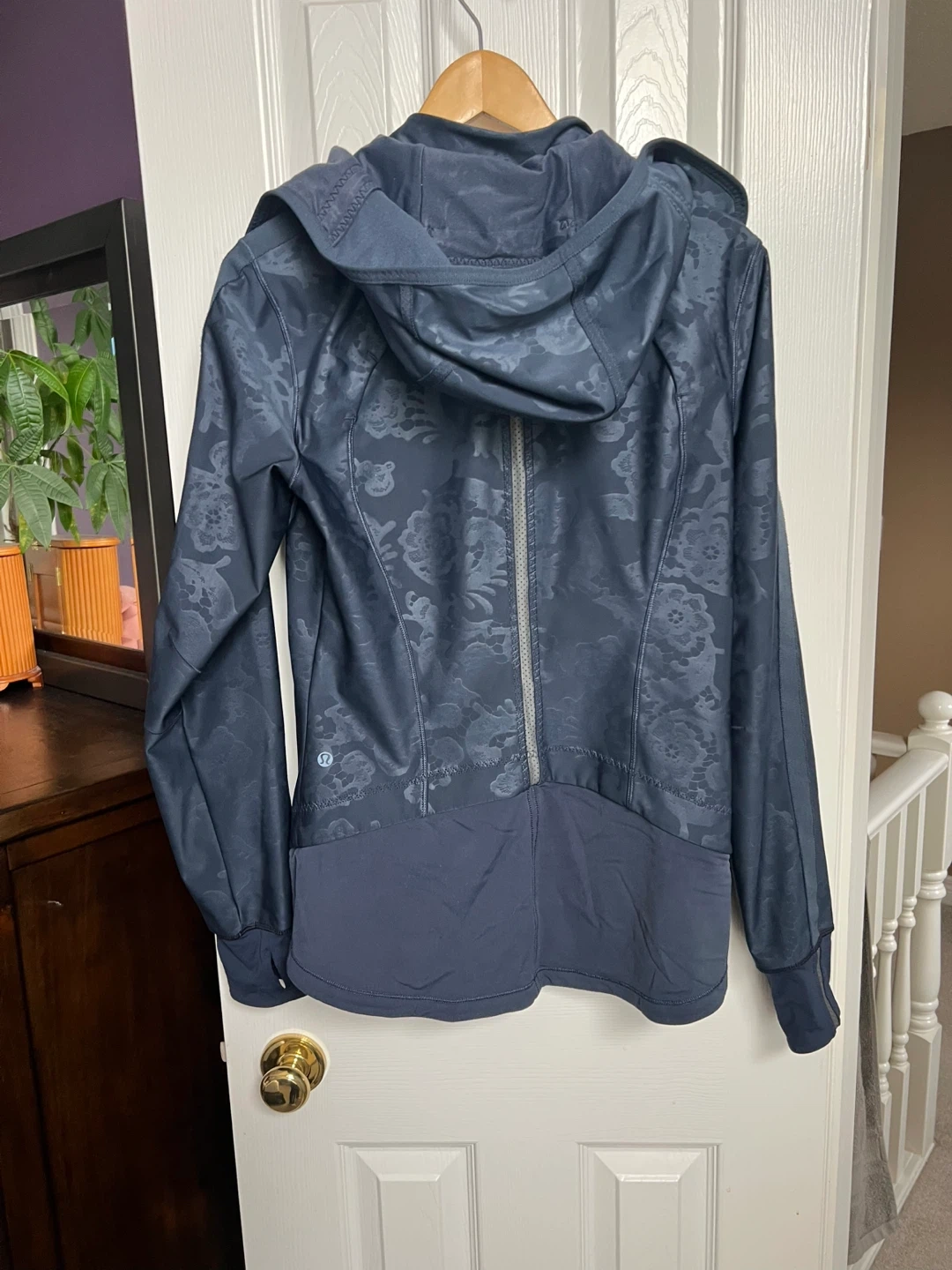 This Lululemon jacket is a lovely navy with a subtle floral embossed pattern. It's designed with a full zip front and a comfortable hood. Perfect for your next workout or casual outing!