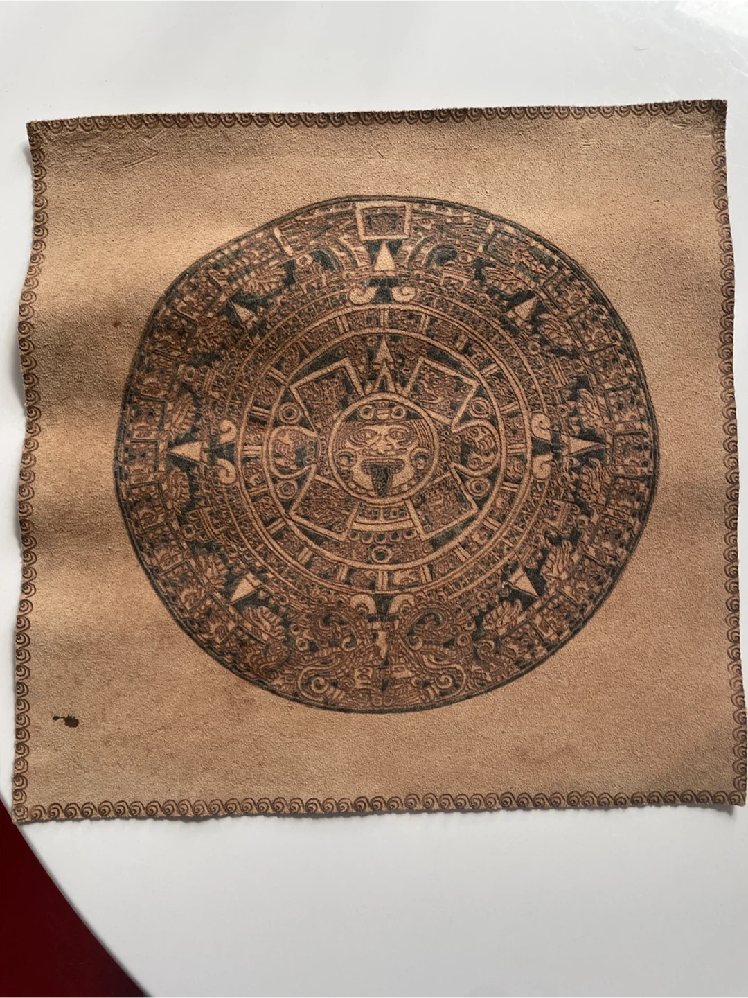 Selling an Aztec leather square. It’s the calendrical system used by the Aztecs as well as other pre-Colombian peoples of central Mexico. It has a unique design and would make a great decorative piece.