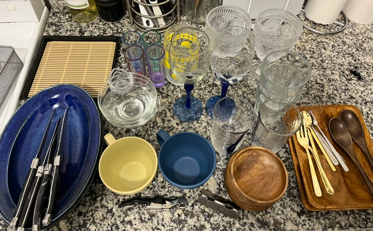 A collection of assorted kitchen and drinkware items. Includes various glasses, cups, a blue serving platter, knives, spoons, forks, and a wooden bowl. Also comes with a sushi mat and two corkscrews.