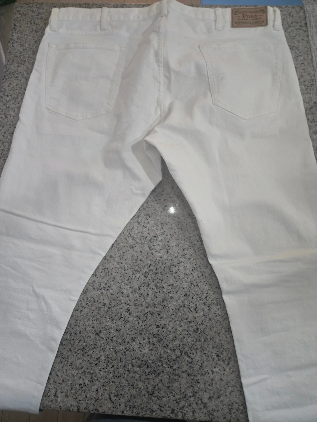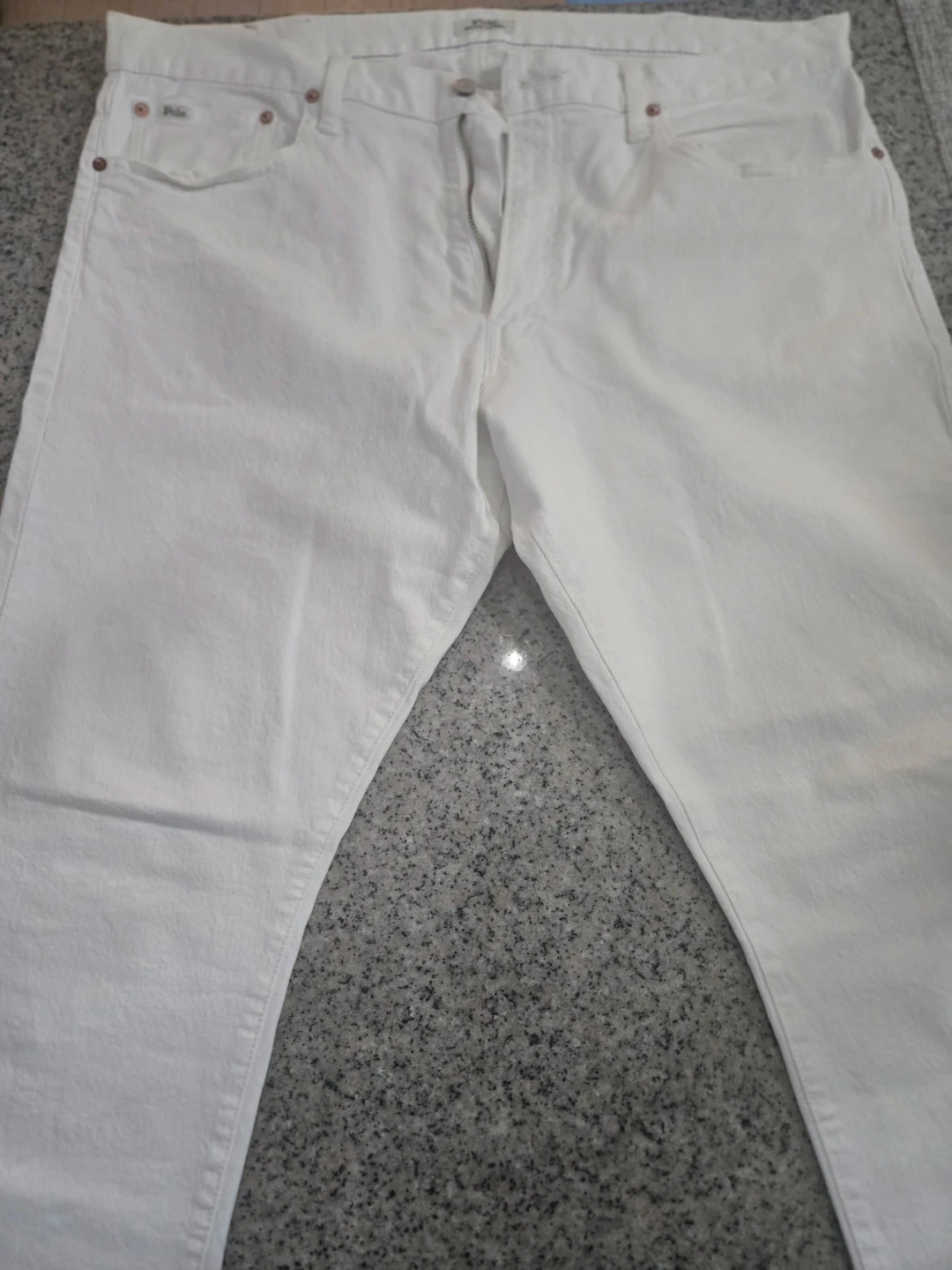 White denim jeans from Polo Ralph Lauren. These trousers are made from a durable cotton blend. They're suitable for casual wear and warmer weather.