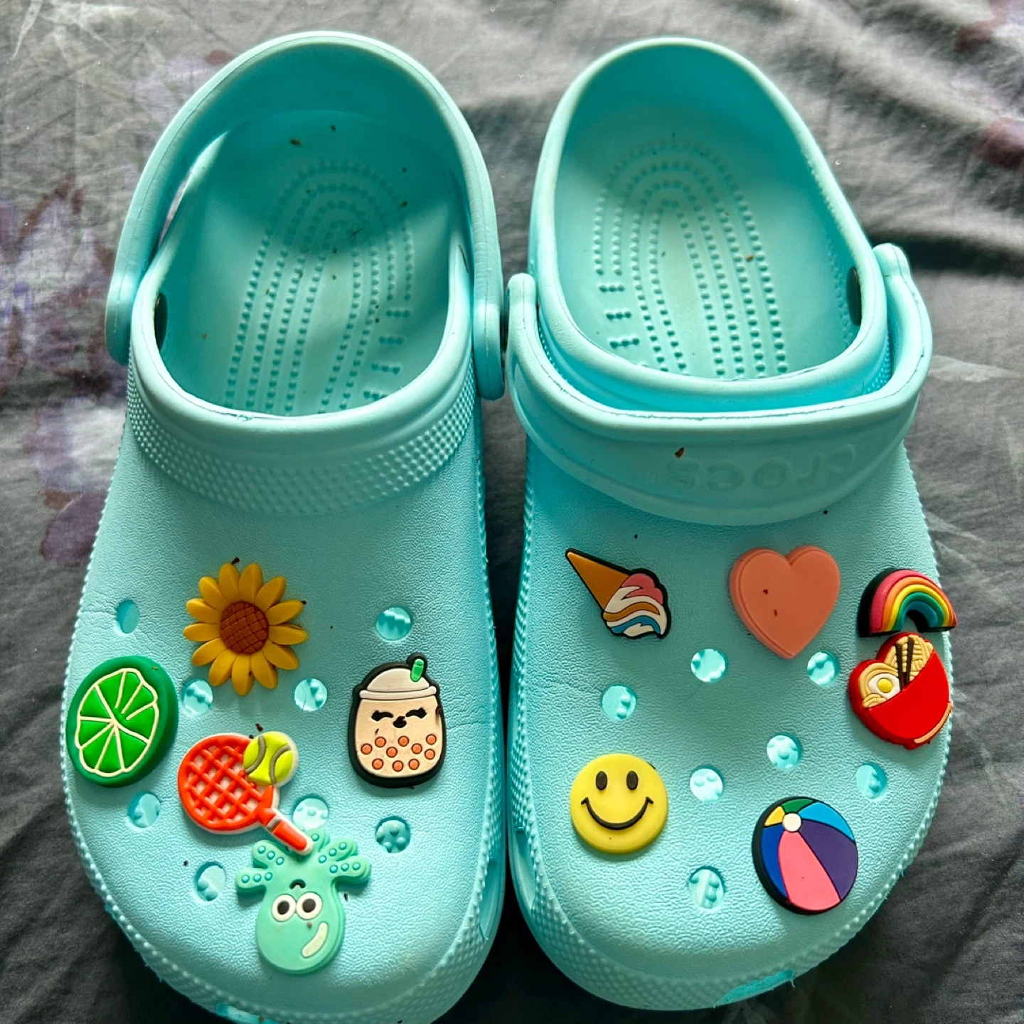 Light blue Crocs, size 8 women’s . With or without come a variety of fun Jibbitz charms, including a sunflower, lime, tennis racket, bubble tea, ice cream, heart, rainbow, ramen, beach ball, and a smiley face!