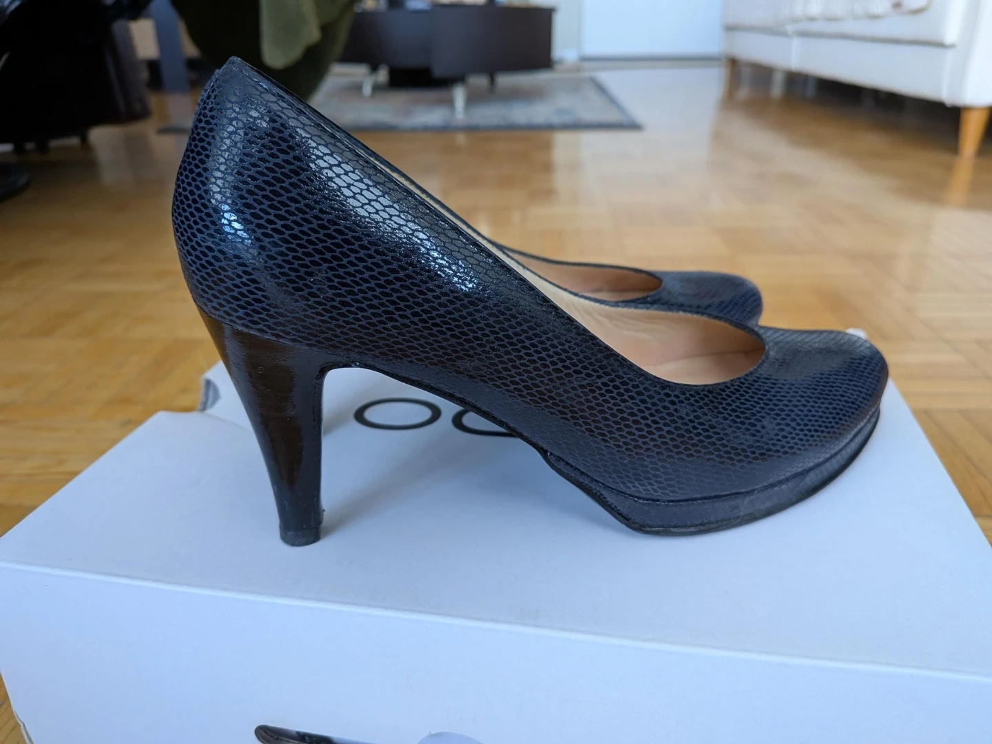 These heels are a stylish navy colour with an embossed texture. They feature a classic pump design with a comfortable heel height. Perfect for dressing up any outfit!