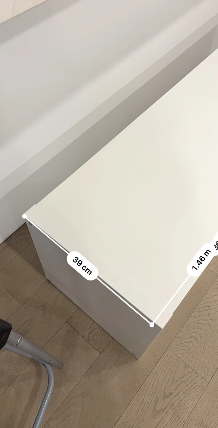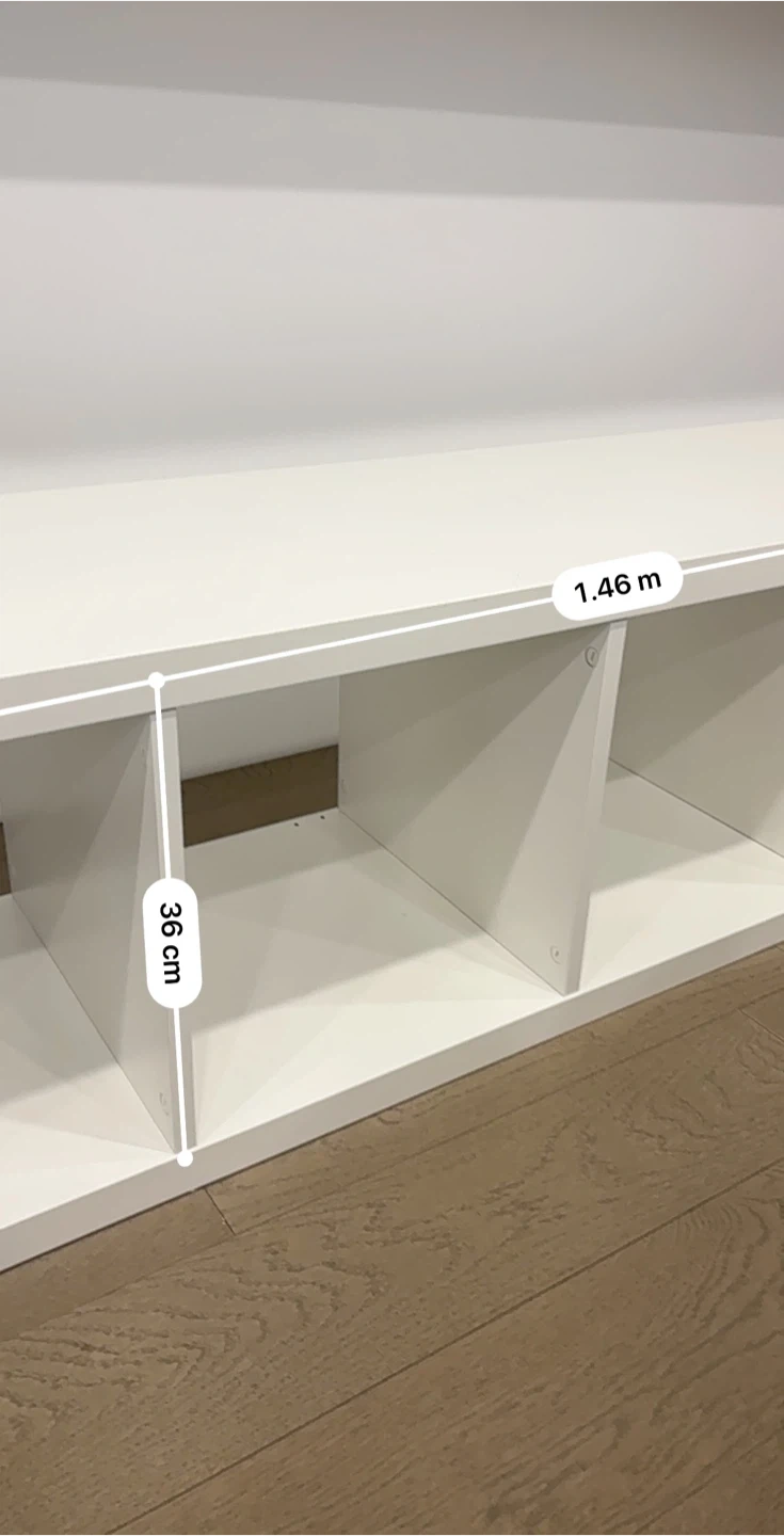 This white storage bench has four cube compartments. It's 1.46 metres long. It's a handy piece for entryway organization!