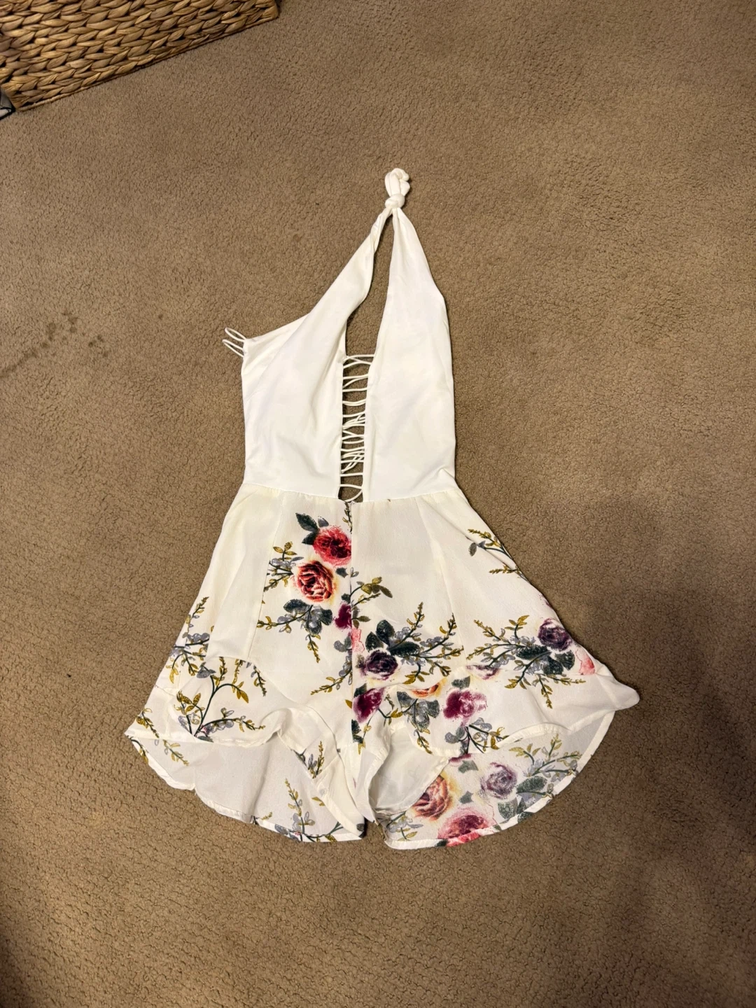 Selling a cute Zaful romper in size small! It's white with a beautiful floral pattern on the shorts part. Zipper on side