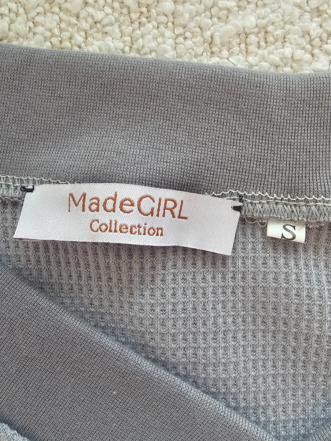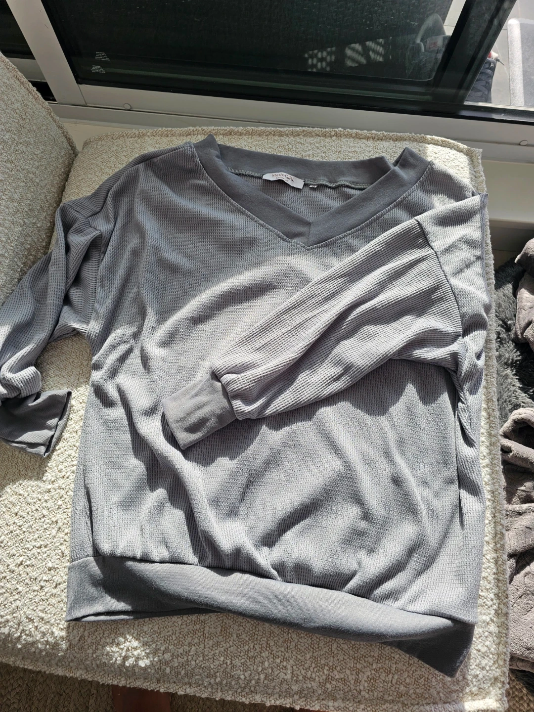 This MadeGirl Collection top is a comfy grey V-neck with long sleeves. It's a size small and made from a textured waffle knit fabric. Perfect for casual wear!