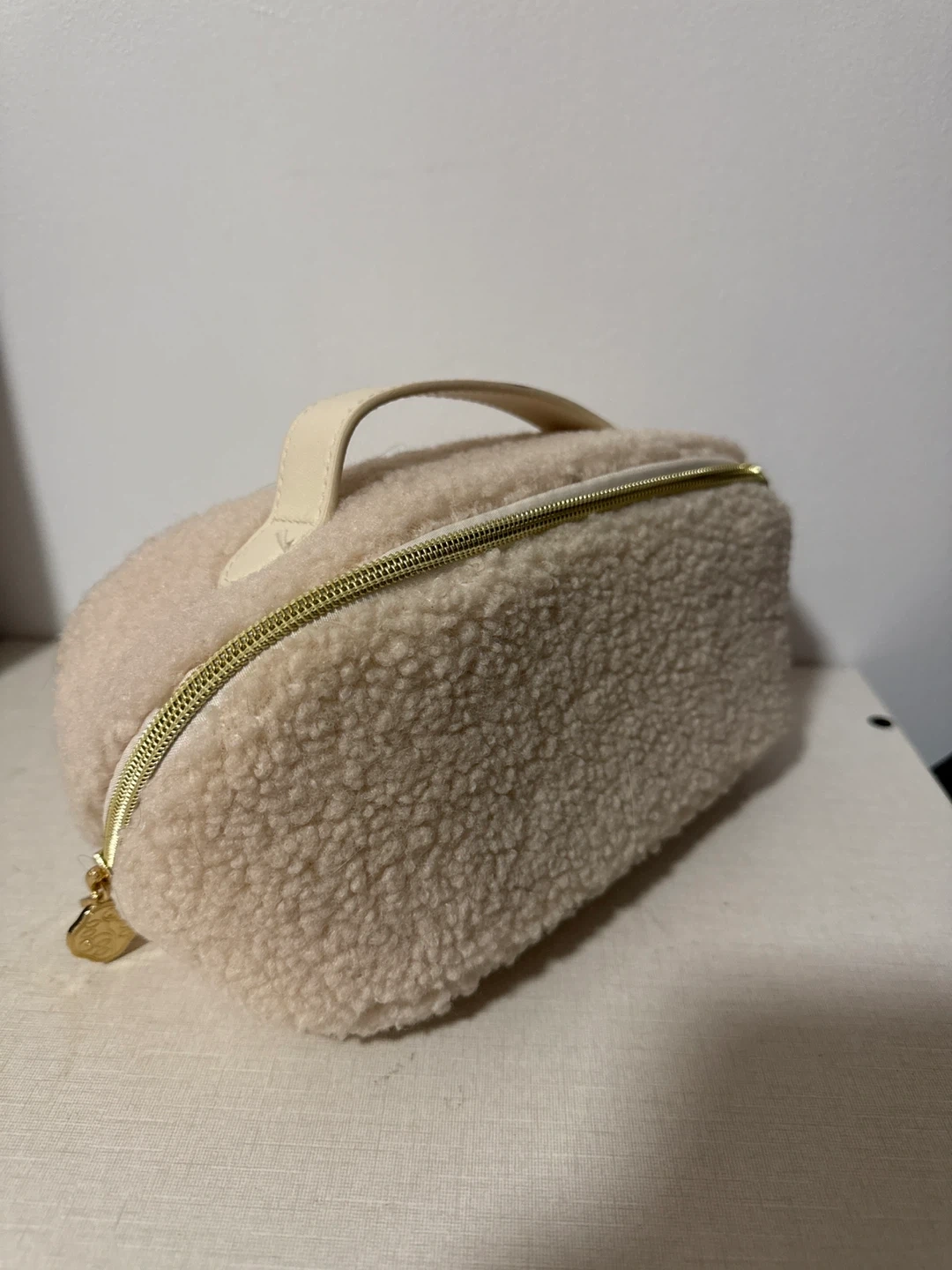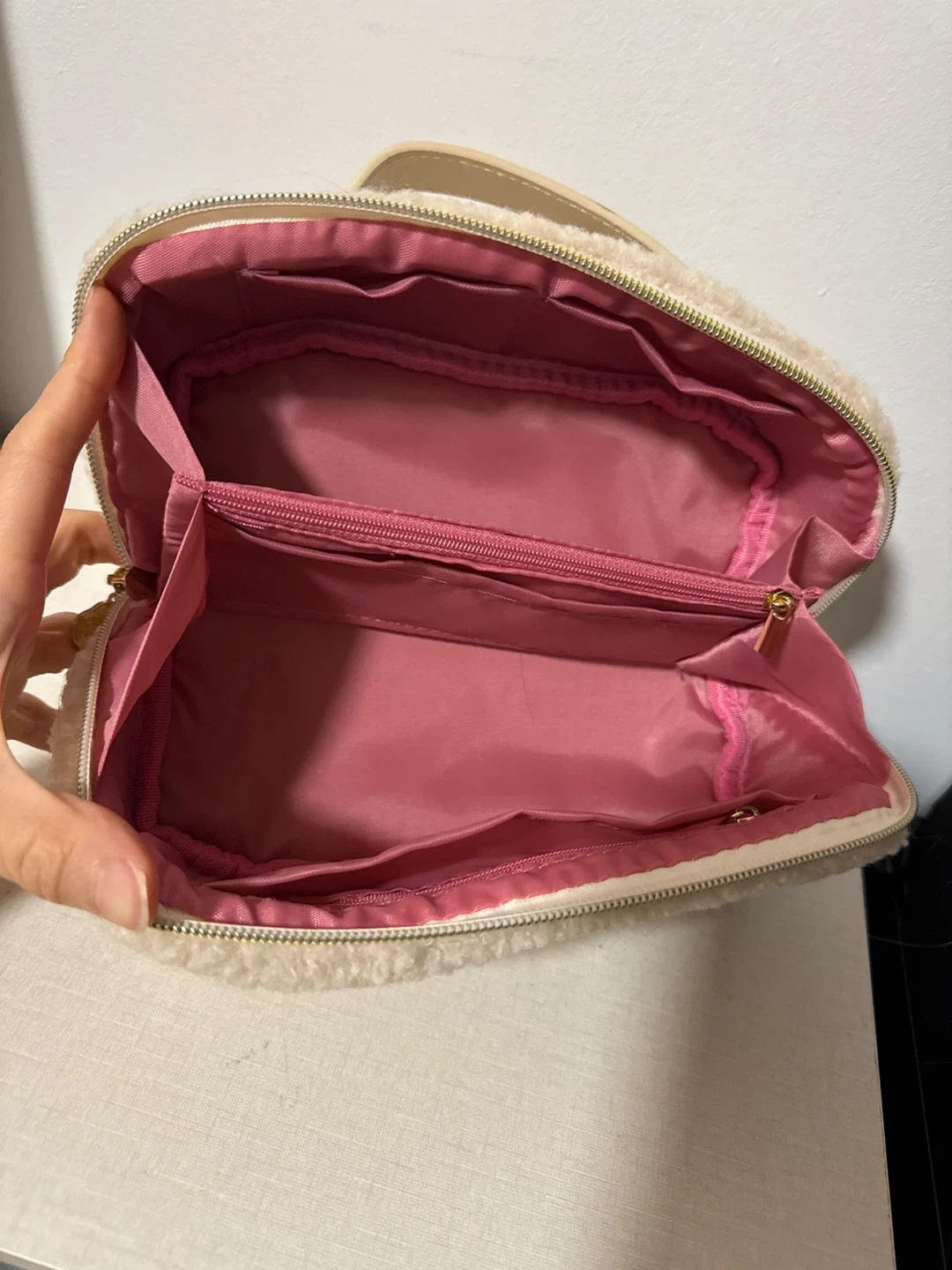 Super cute cream-coloured cosmetic bag with a fuzzy teddy fleece exterior and a pink satin-lined interior. It has multiple compartments and a zippered pocket inside for organization. Perfect for keeping your makeup and toiletries tidy on the go!