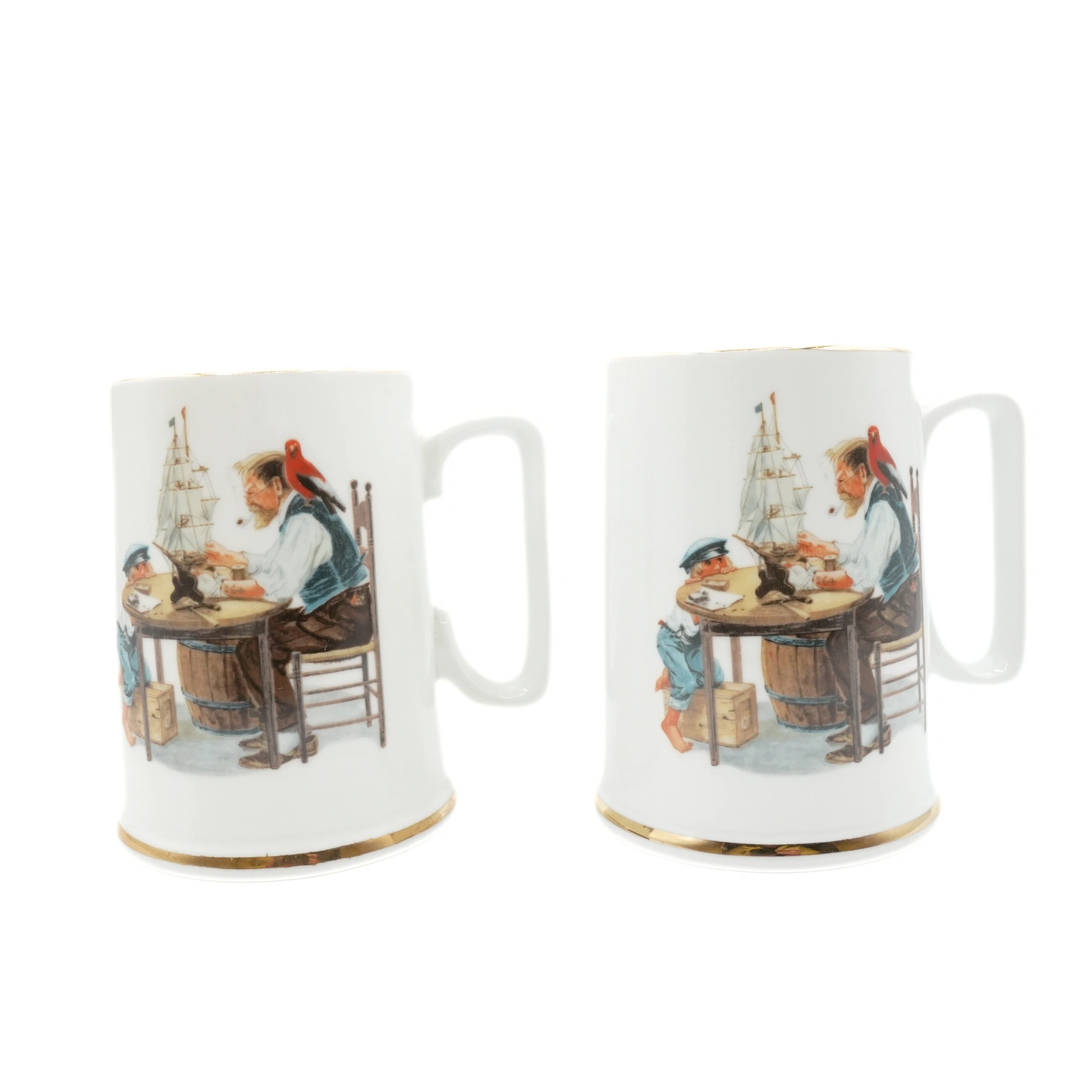 Selling a set of two mugs inspired by the art of Norman Rockwell, titled 'For A Good Boy'. They feature a charming illustration of a grandfather and grandson working on a model sailing ship. These mugs have a gold trim and are in great condition!