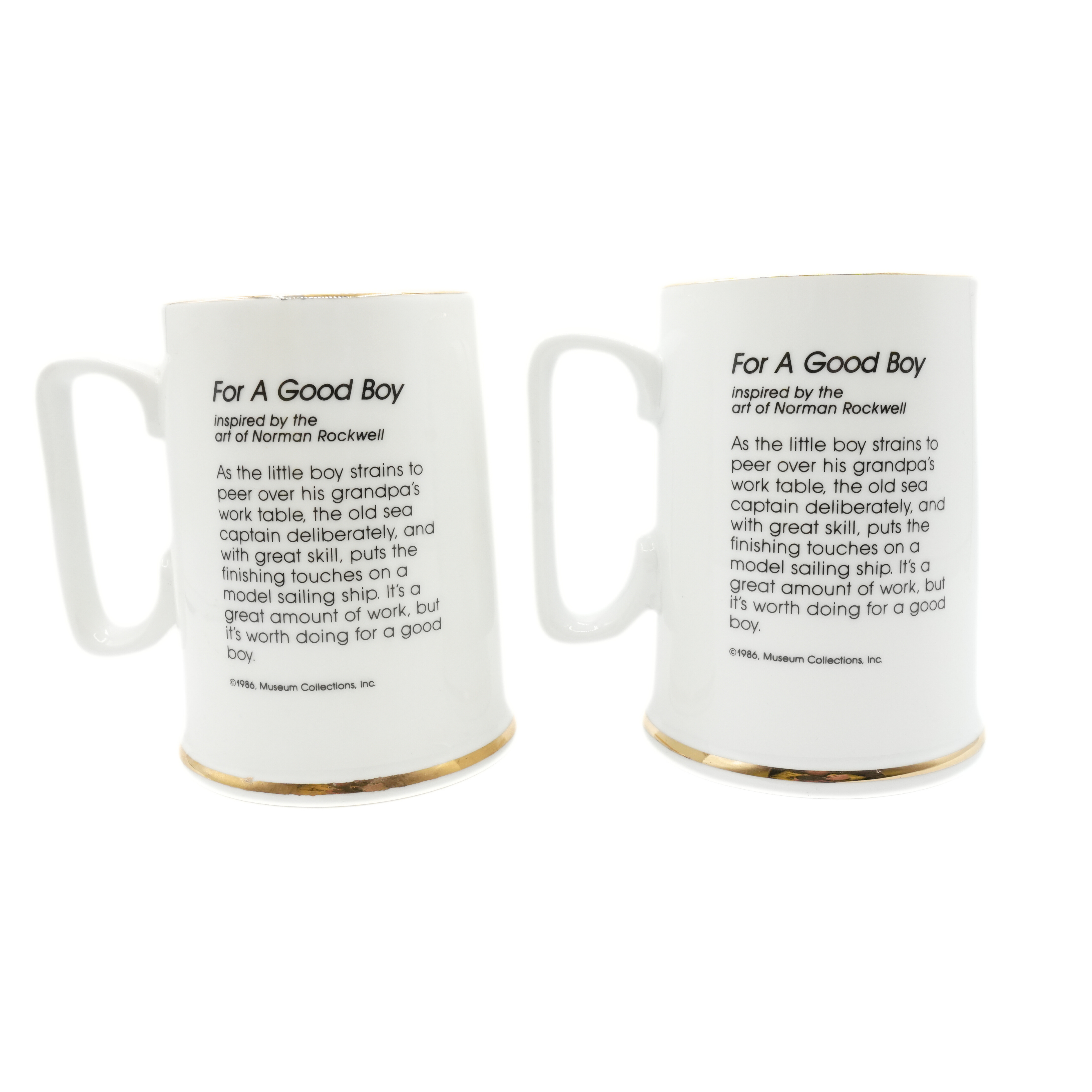 Selling a set of two mugs inspired by the art of Norman Rockwell, titled 'For A Good Boy'. They feature a charming illustration of a grandfather and grandson working on a model sailing ship. These mugs have a gold trim and are in great condition!