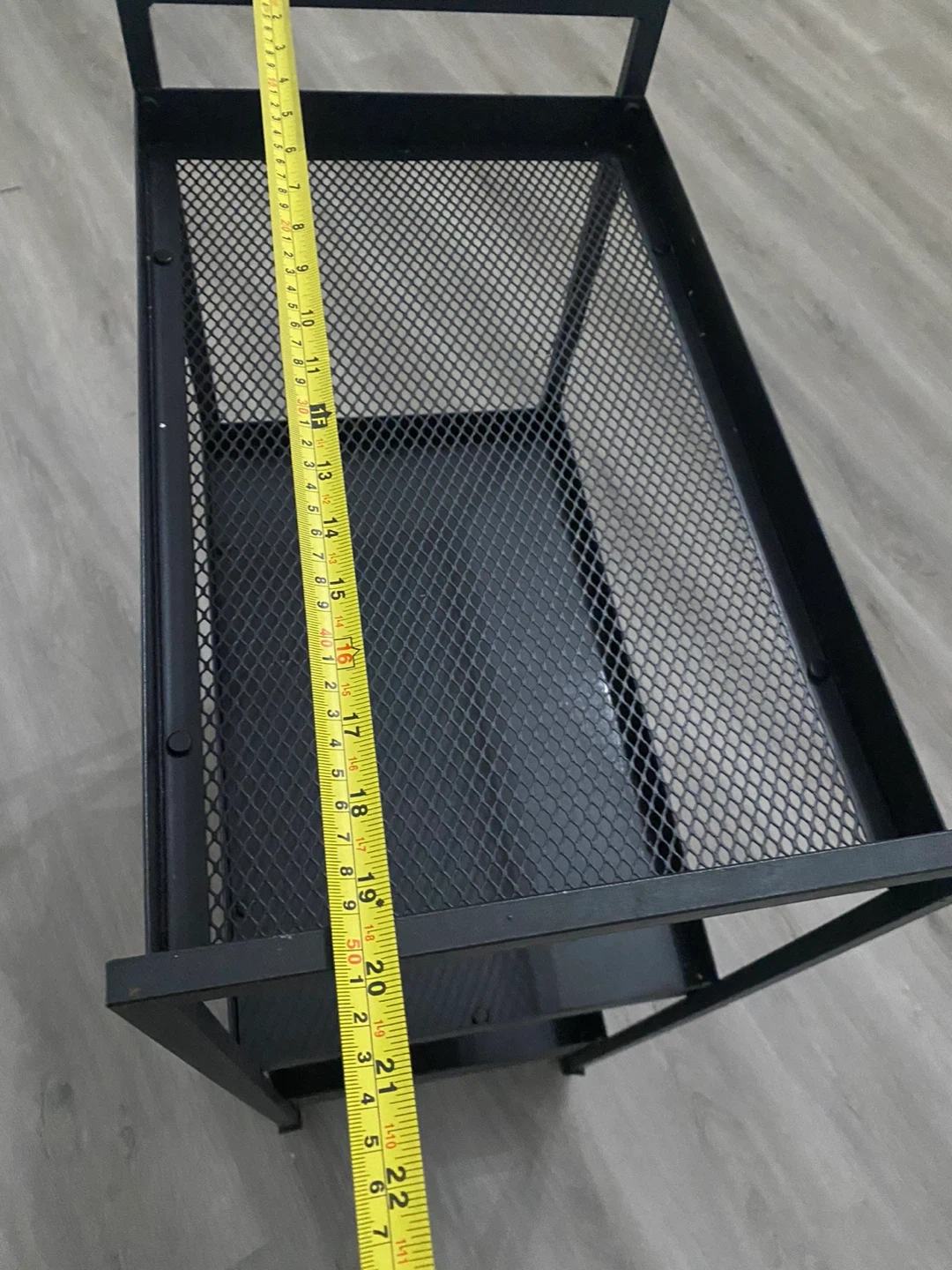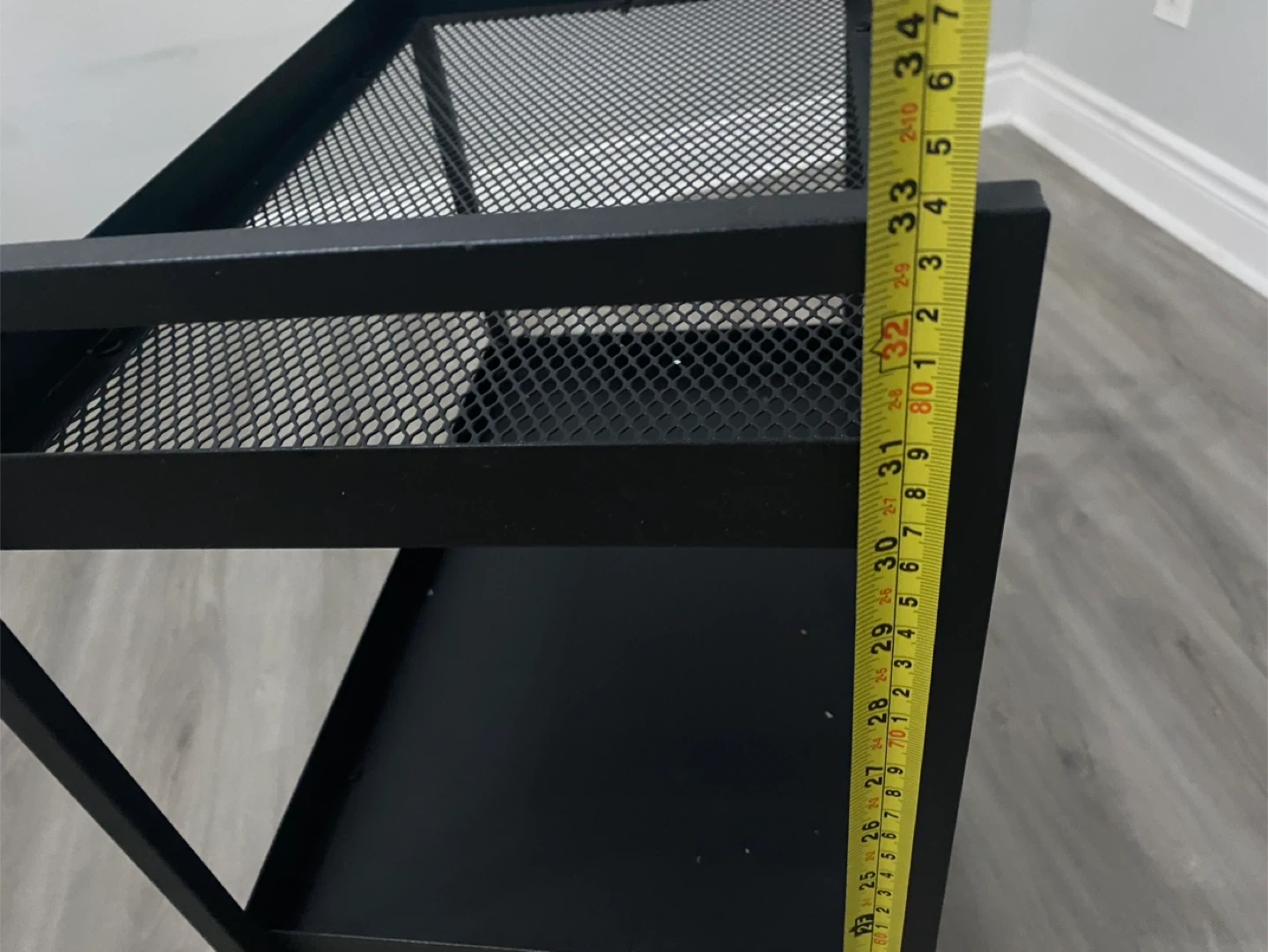 This is a black 3-tier rolling utility cart. It's made of metal with mesh shelving. Includes wheels for easy movement. This cart is handy for storing various items in any room!
