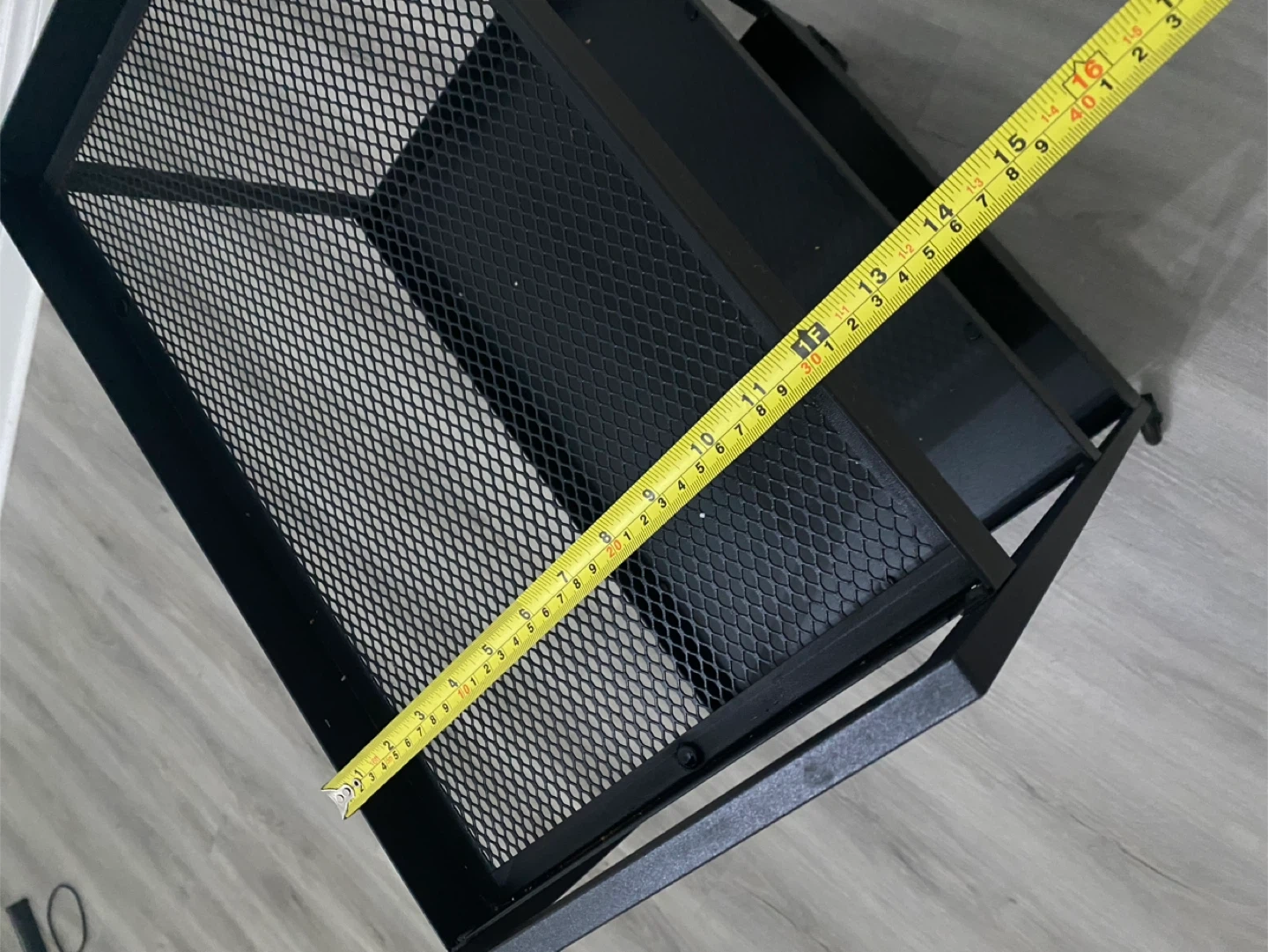This is a black 3-tier rolling utility cart. It's made of metal with mesh shelving. Includes wheels for easy movement. This cart is handy for storing various items in any room!