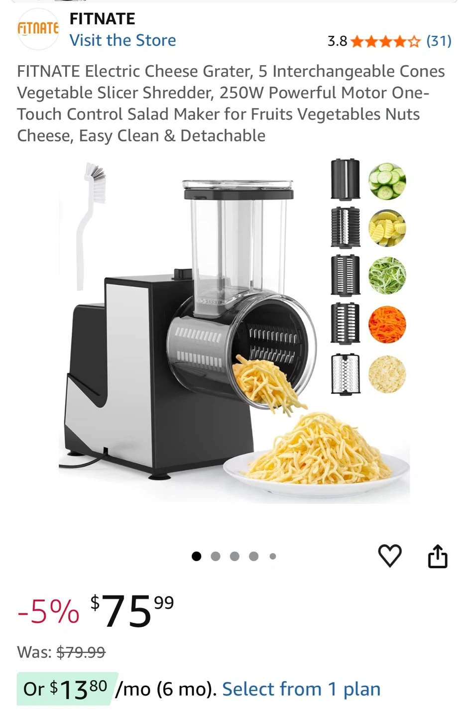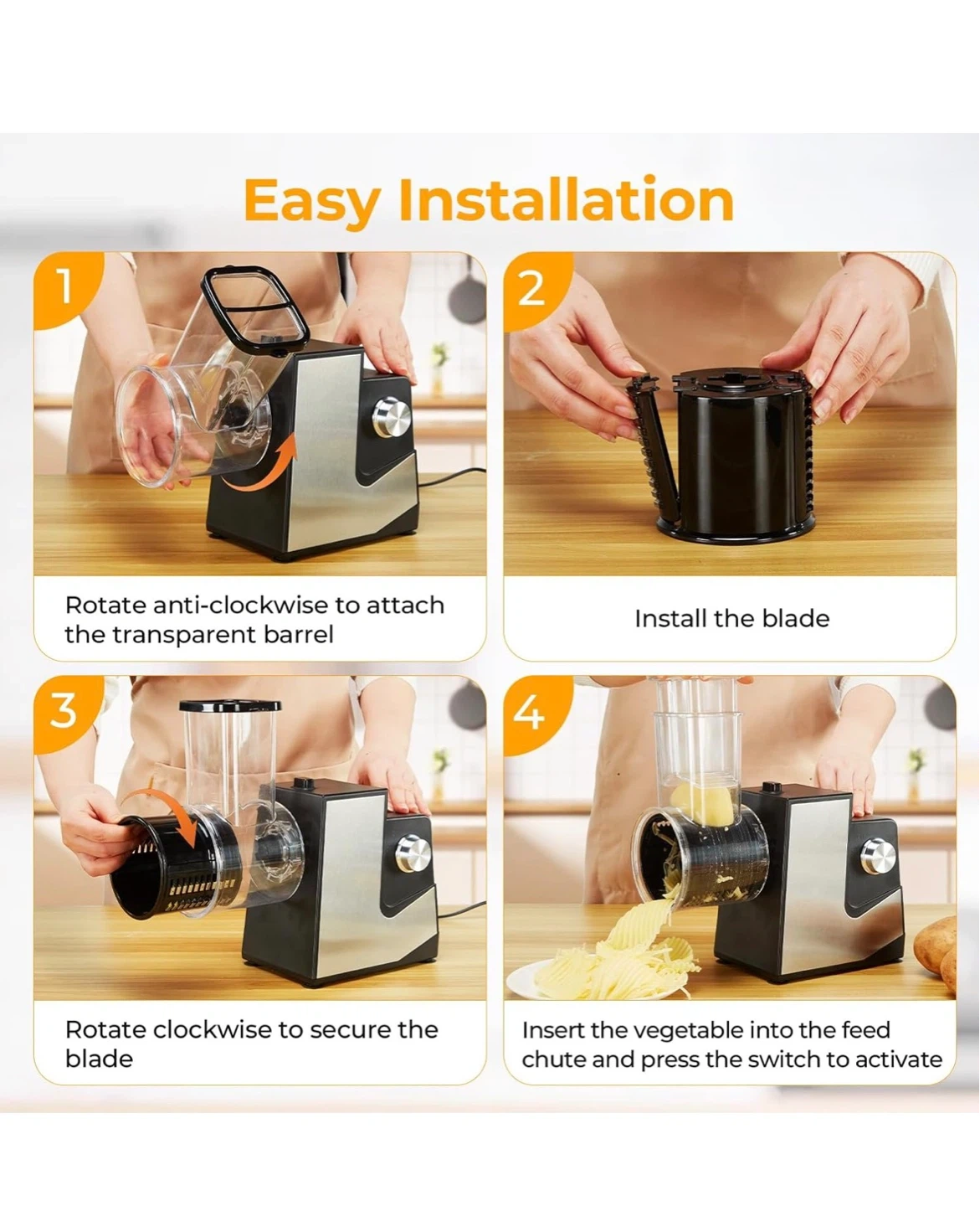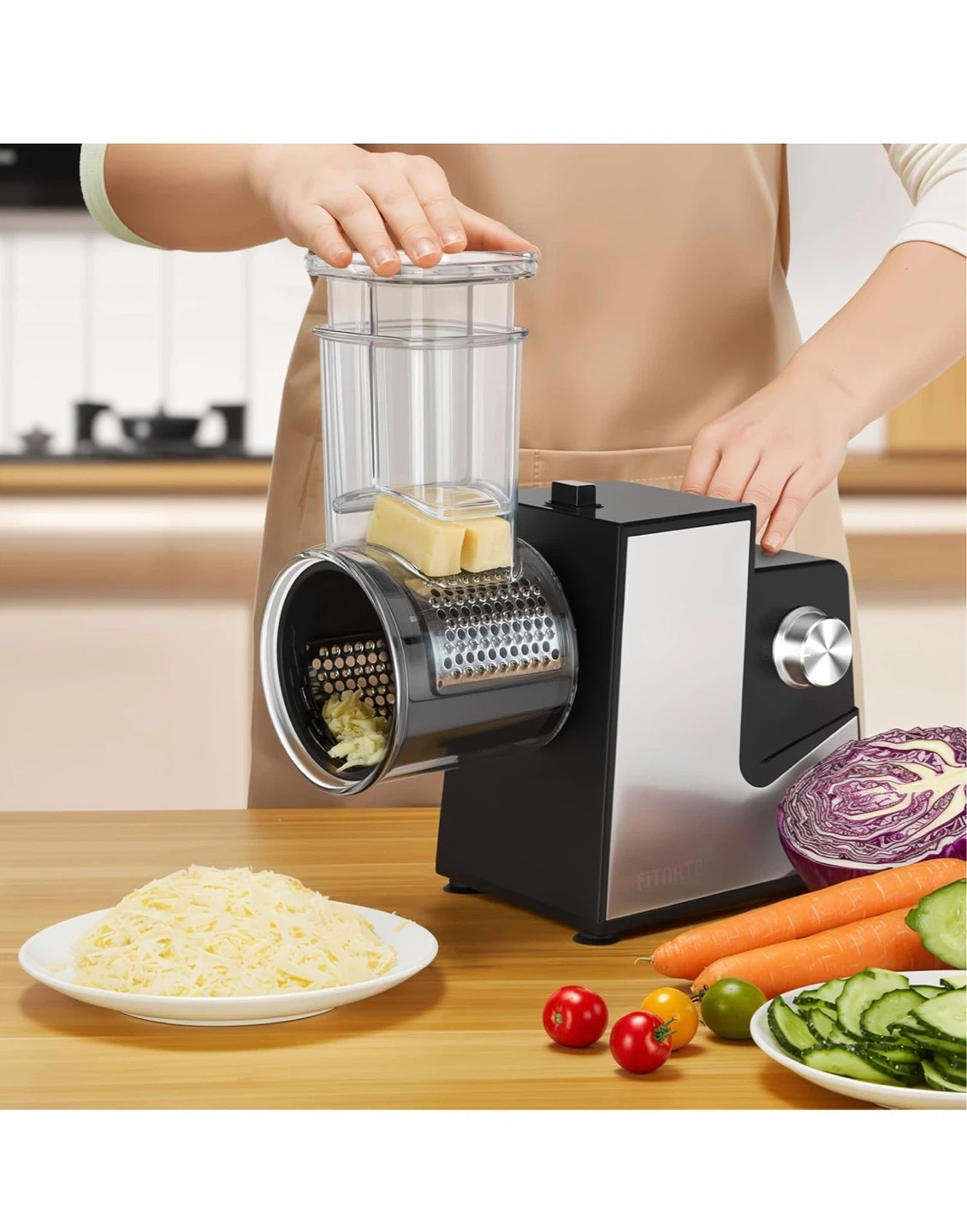 This Fitrate electric food slicer and grater features a powerful 250W motor for efficient chopping. It comes with 5 types of blades including coarse julienne, slice, weave slicing, fine julienne, and a cheese knife/grinding blade. Anti-slip pads on the bottom help hold the unit in place.