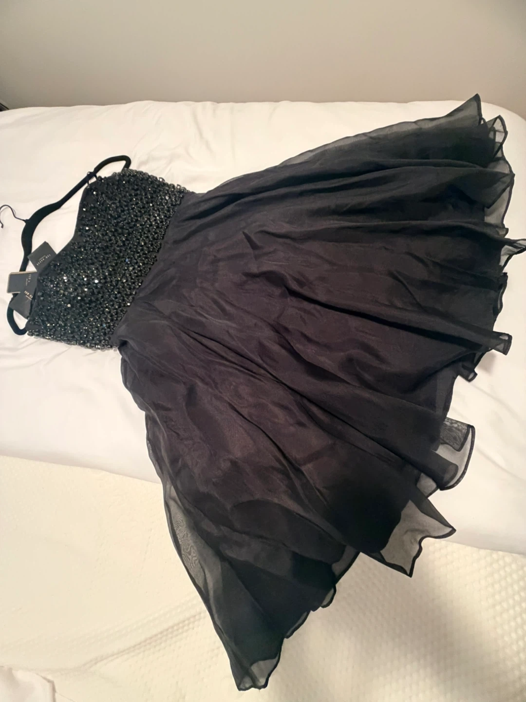 This is a stunning black Ted Baker party dress. It features a heavily embellished bodice with sparkling black beads. The skirt is made of flowy, sheer fabric for a beautiful silhouette. Size is 2- Equivalent to size 6. New with Tags.