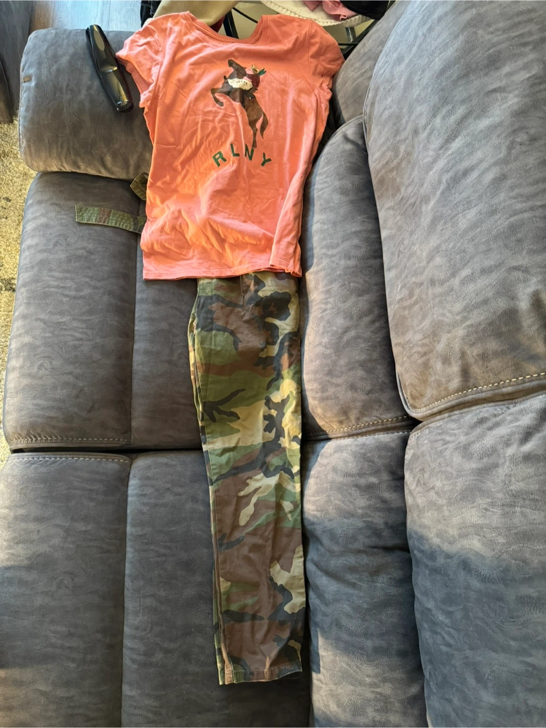 Bundle includes a pair of camouflage cargo pants and a graphic t-shirt. Pants feature a drawstring waist and cargo pockets. The t-shirt is coral pink with a graphic print and the letters 'RLNY'. Both items are suitable for casual wear.