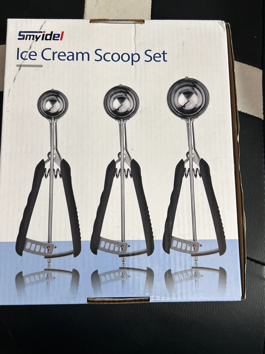 Selling a Smyidel Ice Cream Scoop Set, which includes three different sizes: large, medium, and small. They are made of food-grade stainless steel 18/8 with a TPR coated handle. Great for cookie dough, cupcakes, muffins, ice cream, meatballs, melon, and more!
