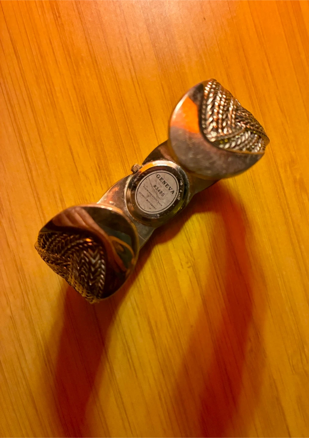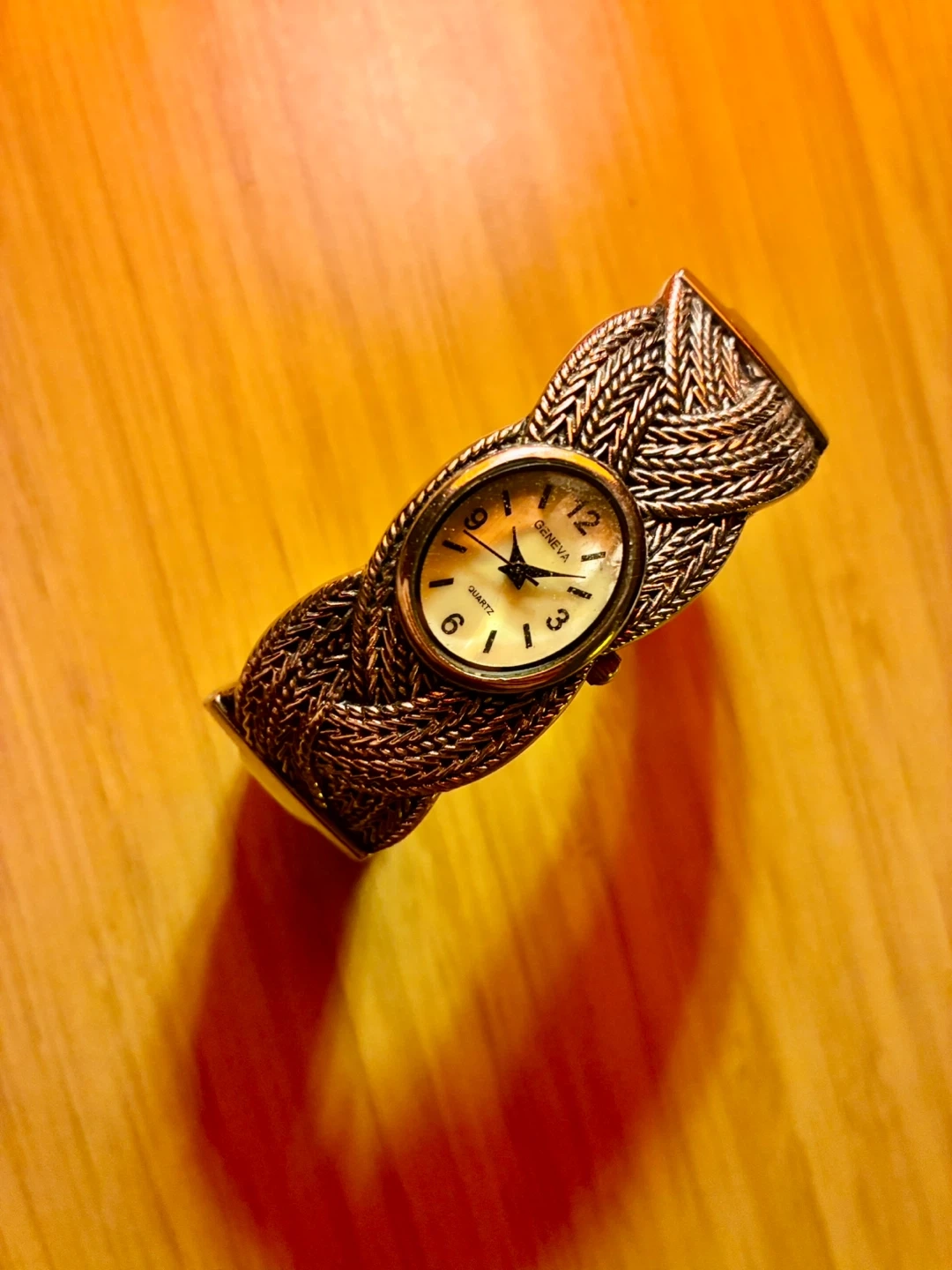 This Geneva women's watch features a quartz movement and a stylish braided metal cuff band. The oval-shaped face has a light-colored dial with clear hour markers. It's a distinctive accessory for everyday wear!
