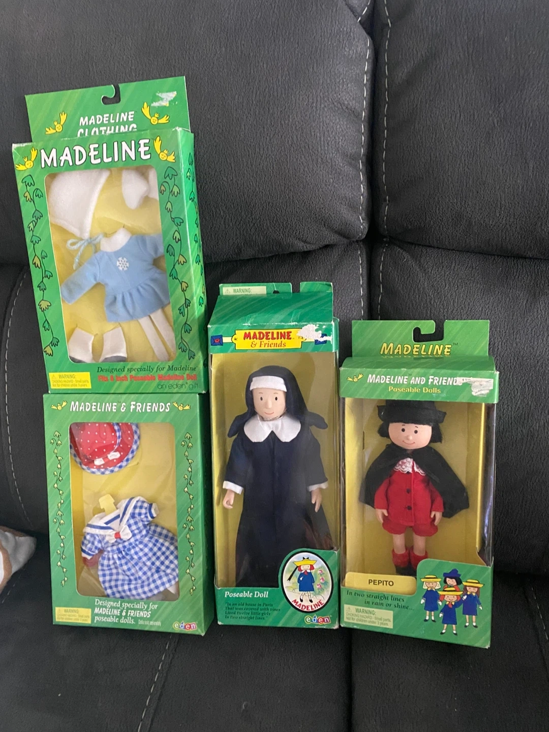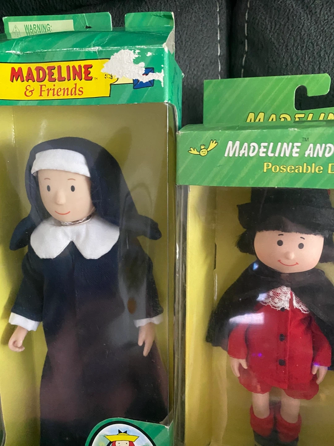 Three poseable Madeline & Friends dolls are included. There's a nun doll, a doll named Pepito in a red coat, a blue gingham dress and a blue snowflake dress. They come in their original packaging.