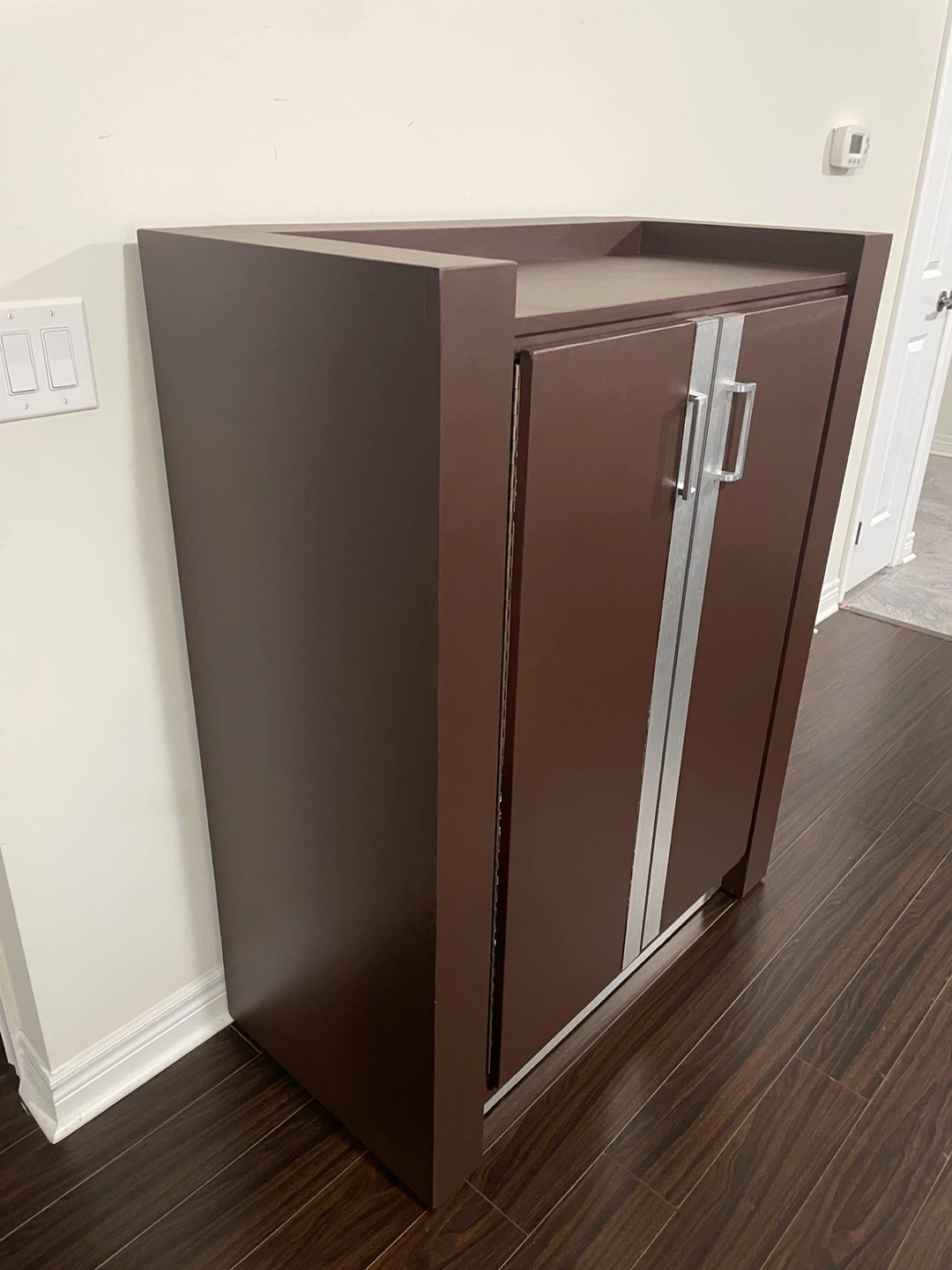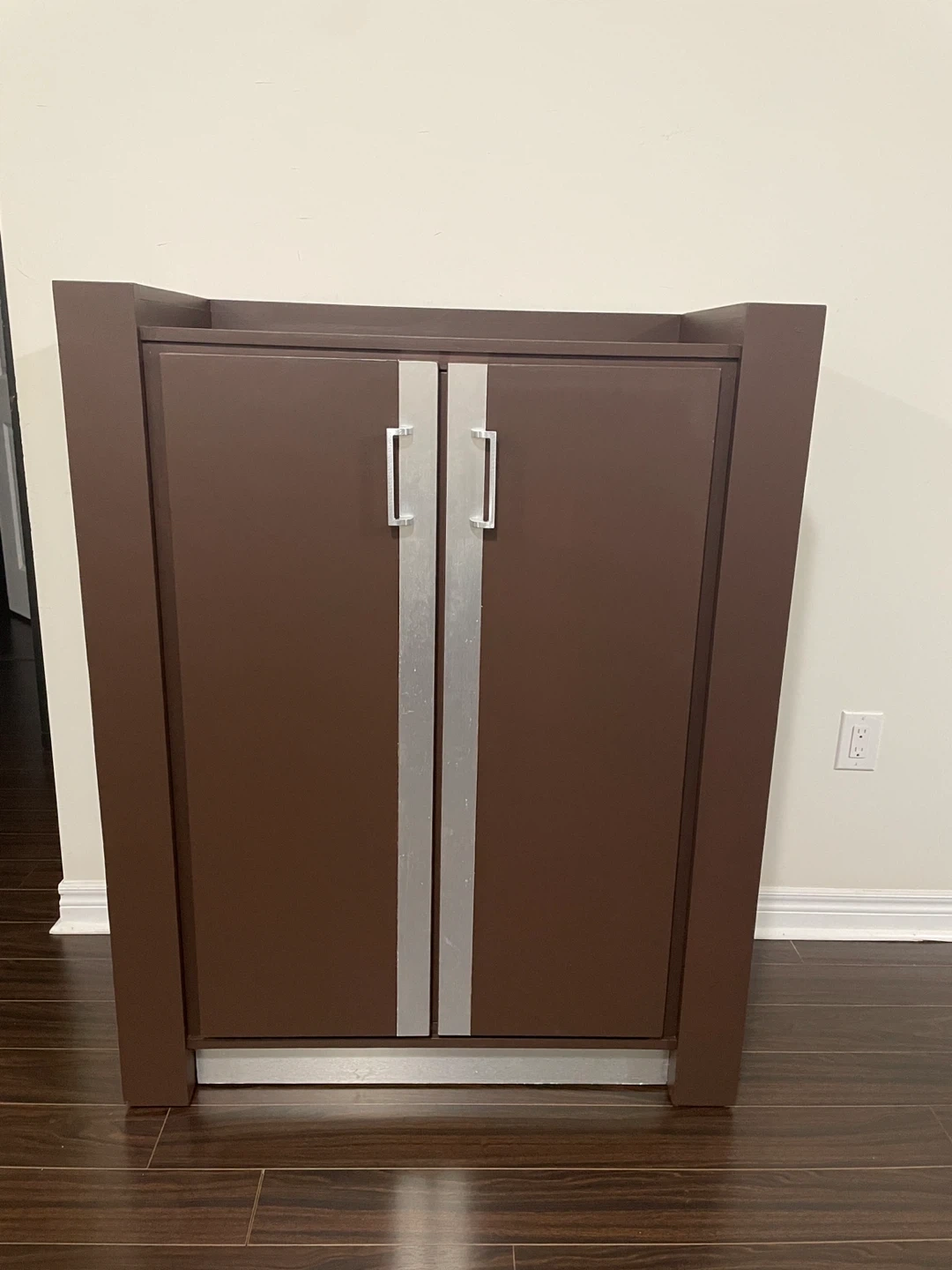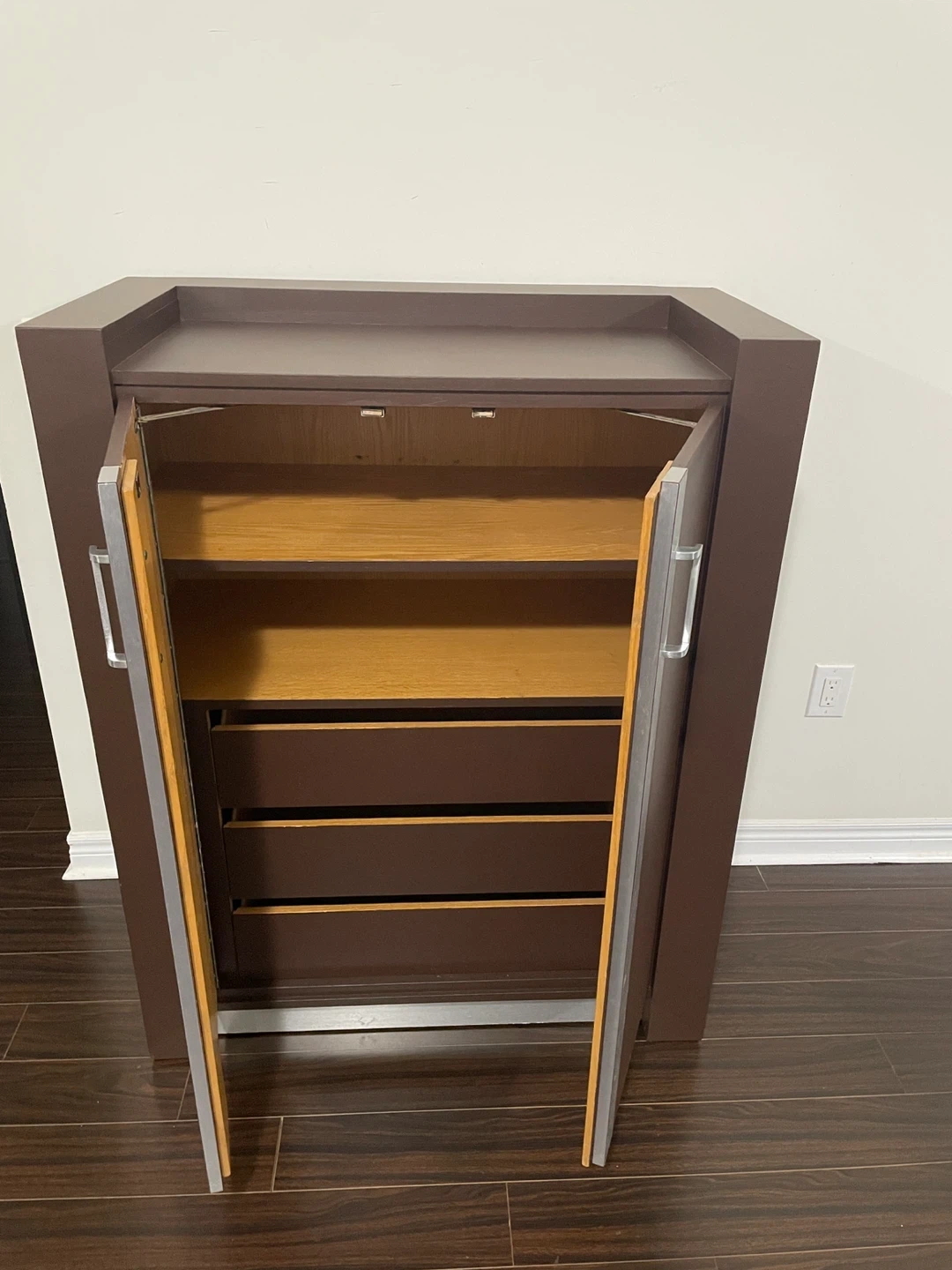 A brown cabinet featuring double doors with silver handles. It has internal shelving and drawers. This cabinet offers ample storage space for various items.