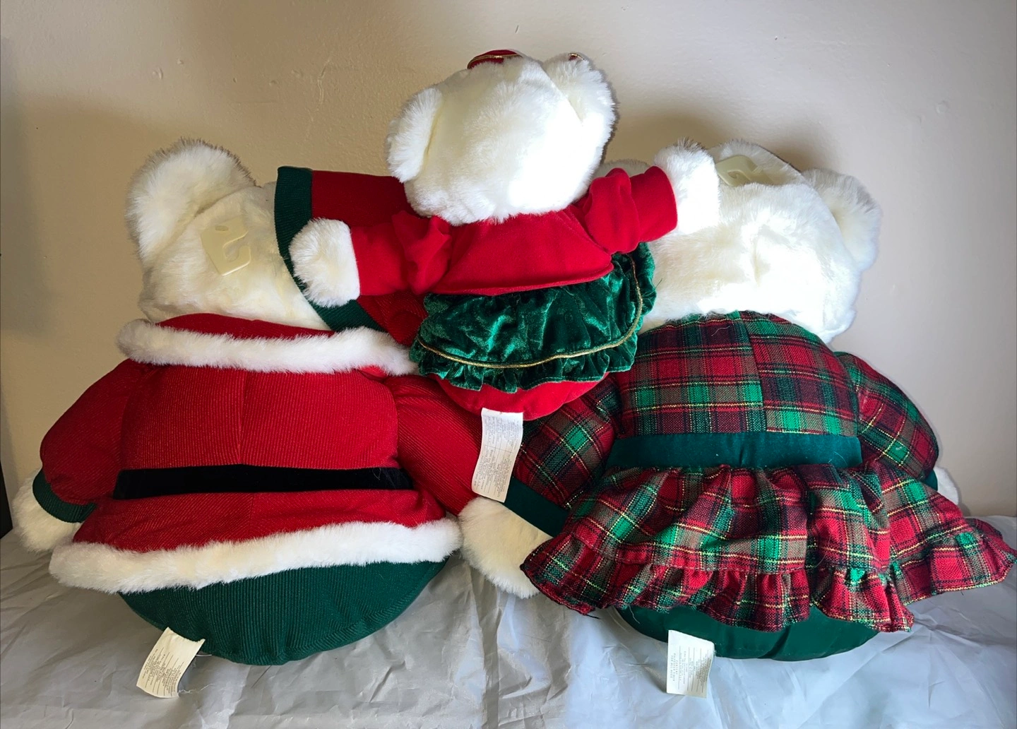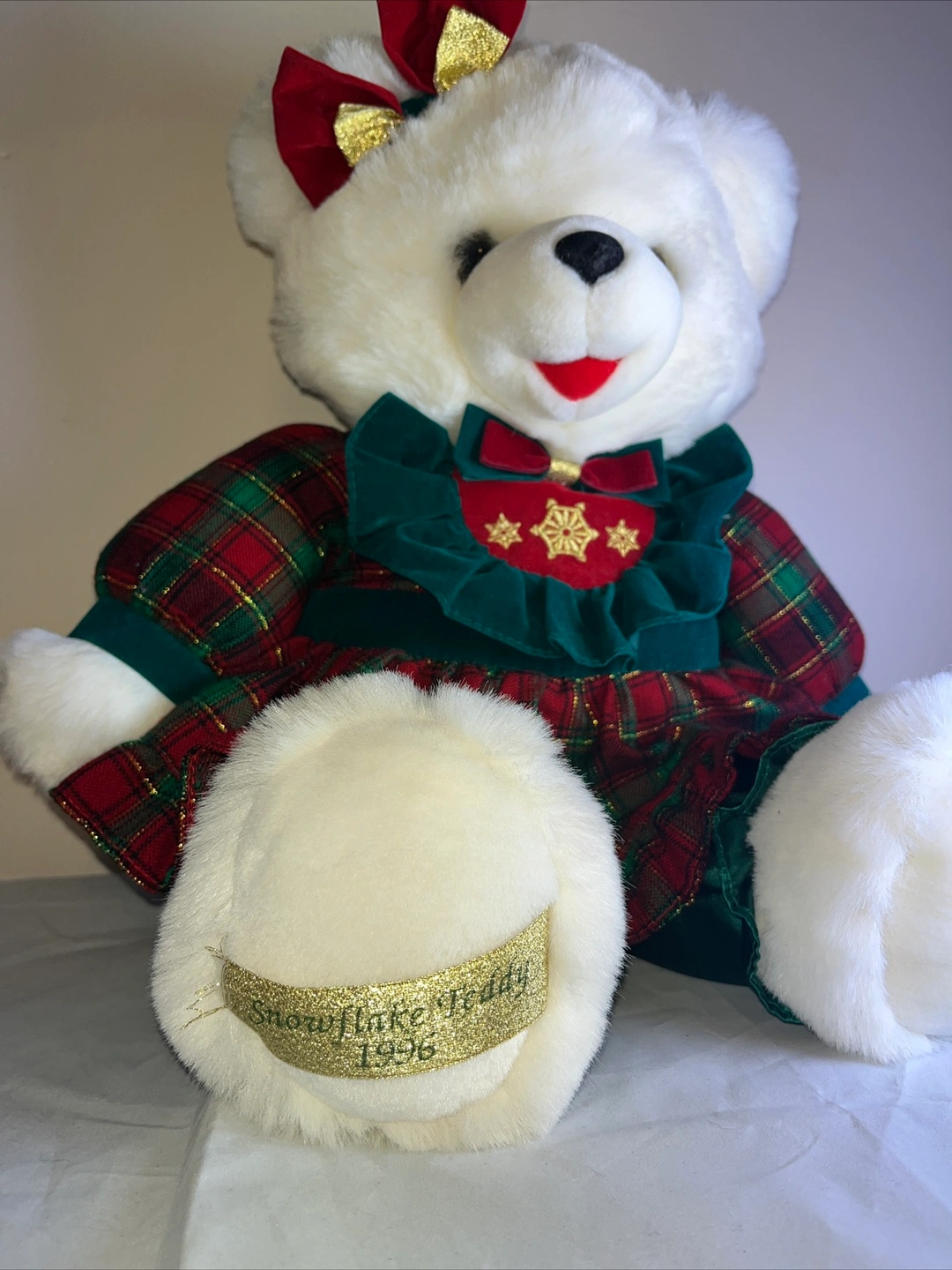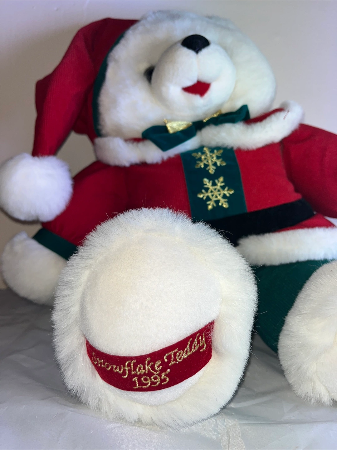 This lot includes three vintage Snowflake Teddy Bears from Dan Dee, dating back to 1995, 1996, and 2001. These medium-sized stuffed animals are in used condition but still have plenty of love to give. Each bear features a unique snowflake pattern on its feet and a cute red bow around its neck.