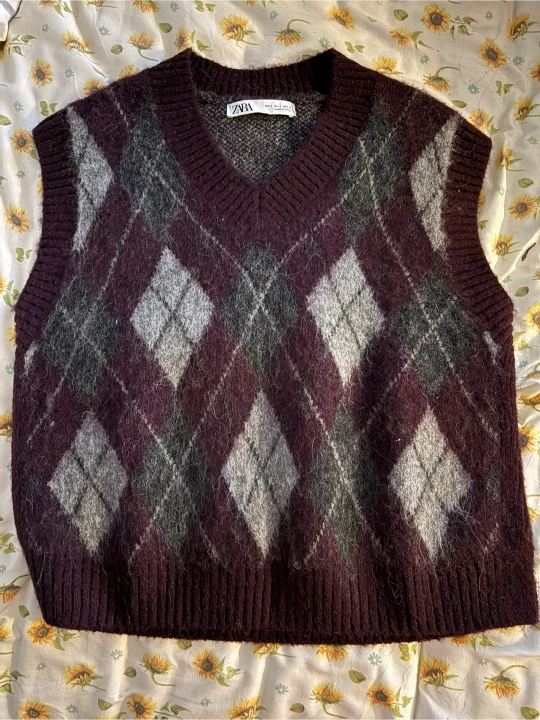 Cozy Zara sweater vest in a maroon argyle pattern! Perfect for layering or adding a touch of retro style to your wardrobe. It's in great condition, never been worn