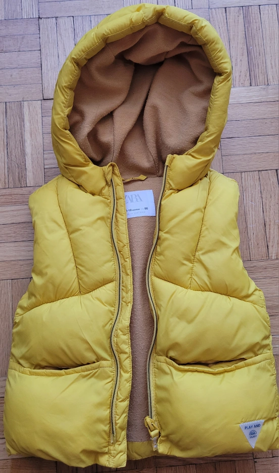 Here's a cute Zara kids puffer vest in a lovely yellow color! It's sized for 12-18 months (86 cm). Perfect for layering on those cooler days. It has a tiny almost non visible stain in front at the bottom (as seen in the last photo). Other than that in a great condition!