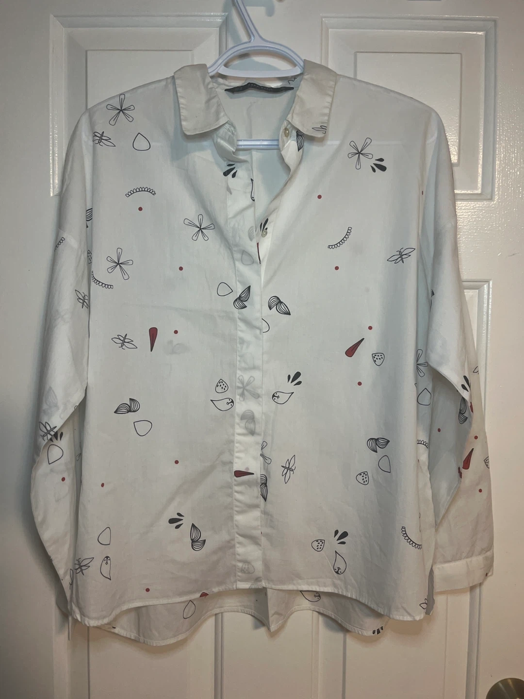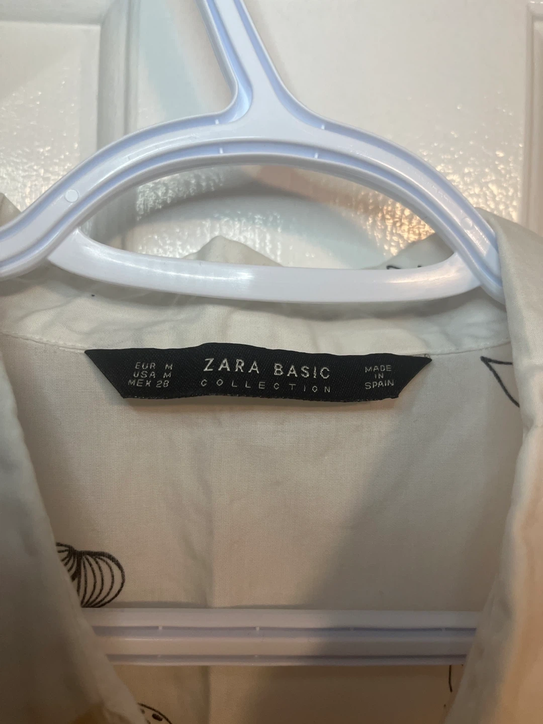 49Here's a cute Zara Basic Collection blouse in size M! It features a unique pattern on a white background. Perfect for a casual or dressed-up look!