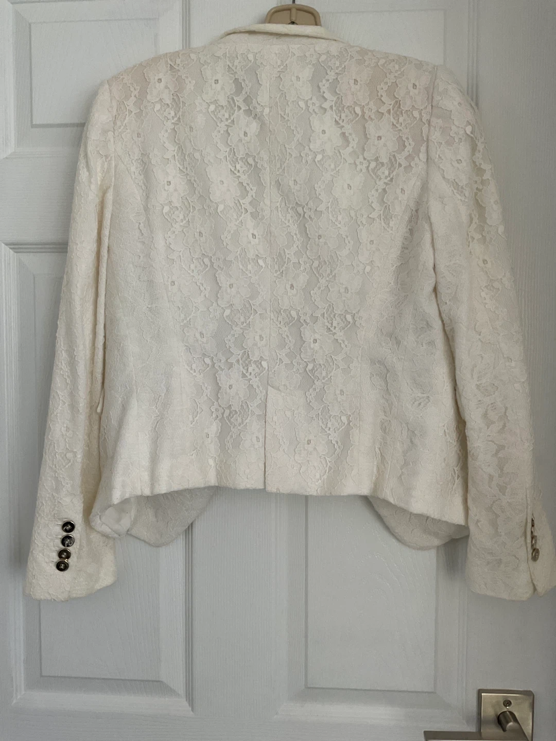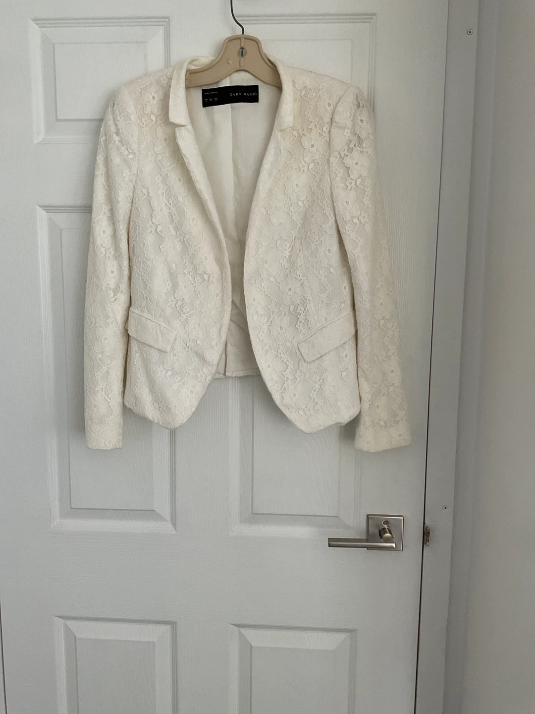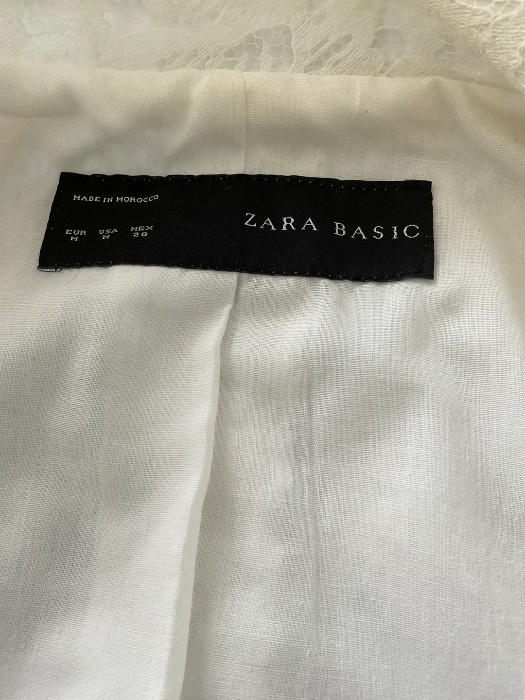 Selling a Zara Basic lace blazer in size medium. It's a beautiful piece that would be great for layering or dressing up an outfit. The blazer is made in Morocco and has a delicate lace pattern. It's in great condition and ready for a new home!