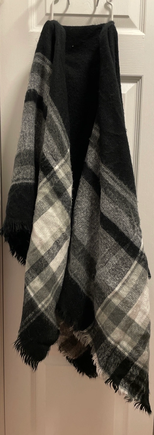 Cozy, black, grey and white plaid blanket scarf. Soft material. Fringe detail. Perfect for fall and winter. Free with purchase of $2 n above