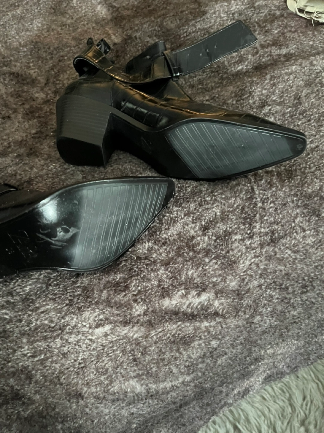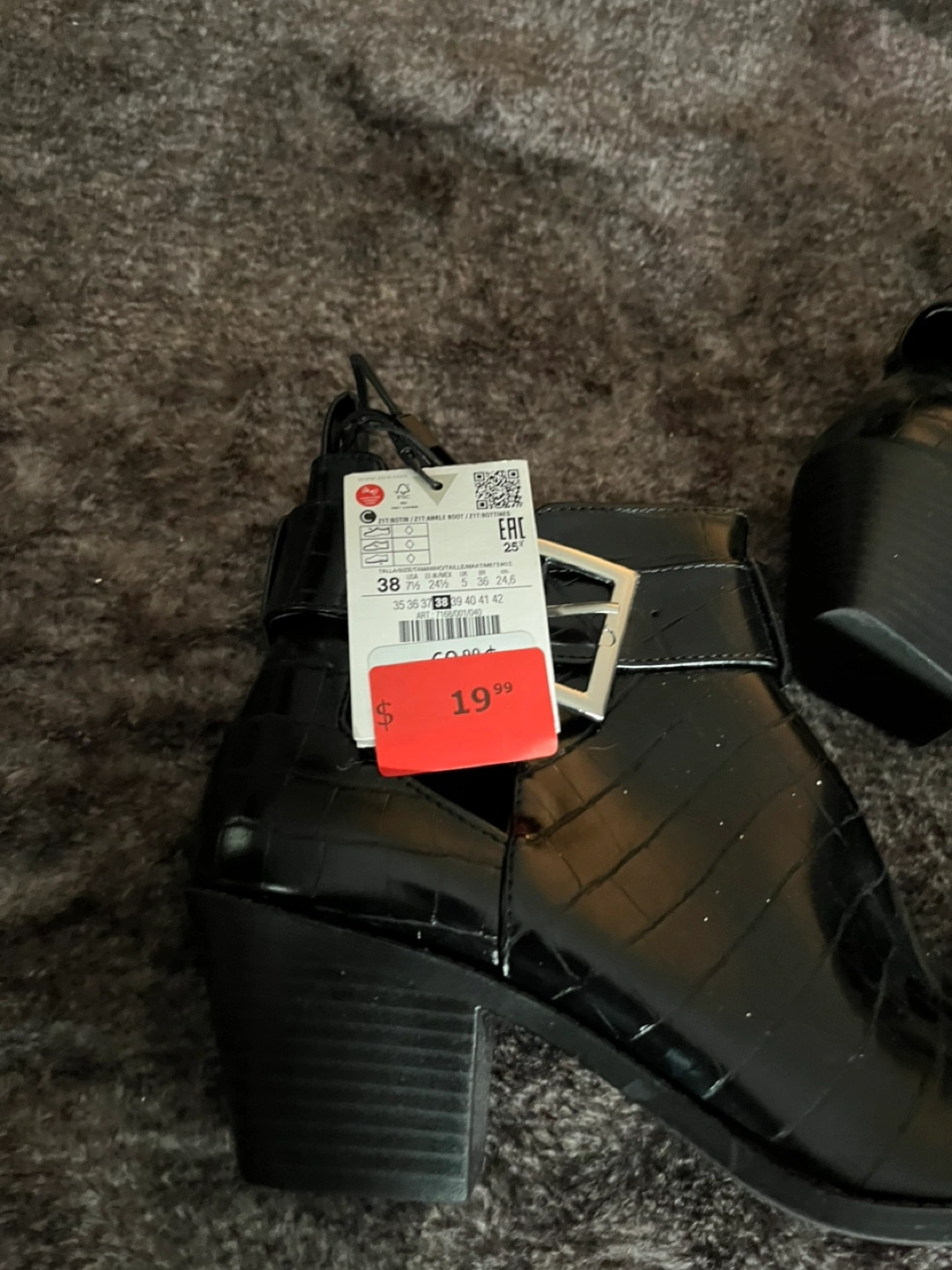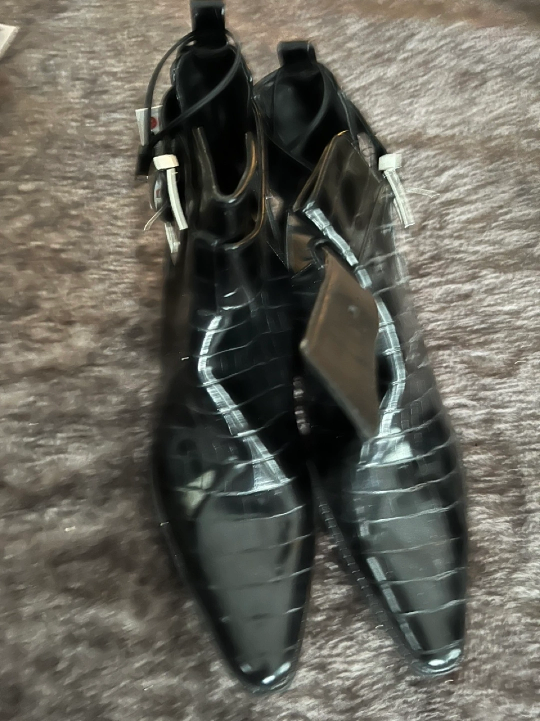 382Black ankle boots. Croc-embossed leather-look. Block heel. Cut-out detail. Size 38. New with tags.