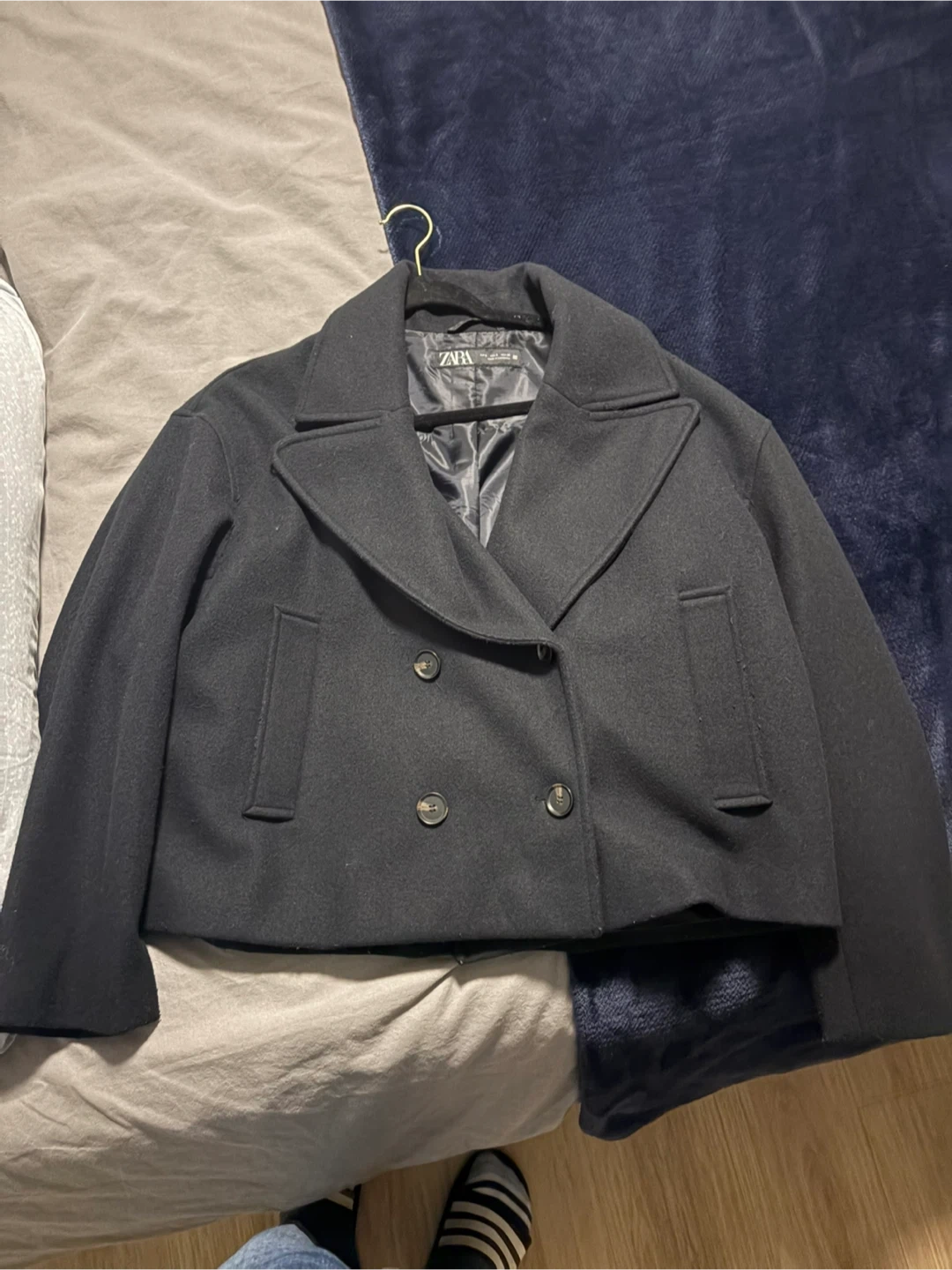 10Selling a Zara black cropped pea coat! It's in great condition and perfect for layering. It features a double-breasted button closure and a classic collar. This coat is a stylish and versatile addition to any wardrobe!