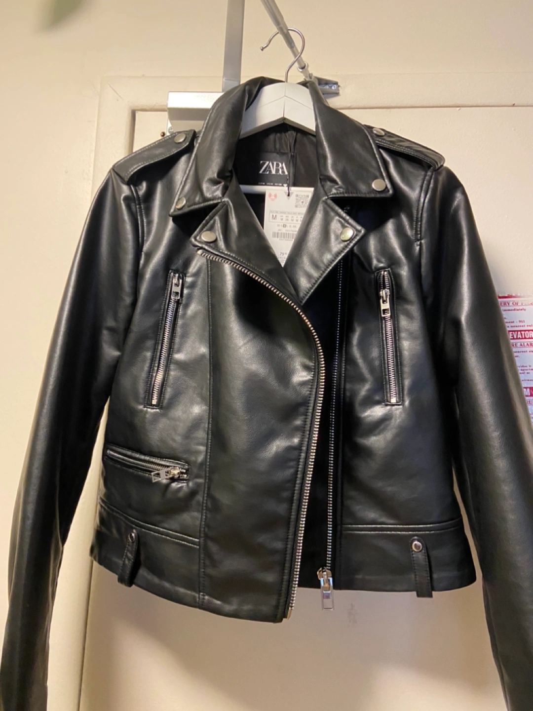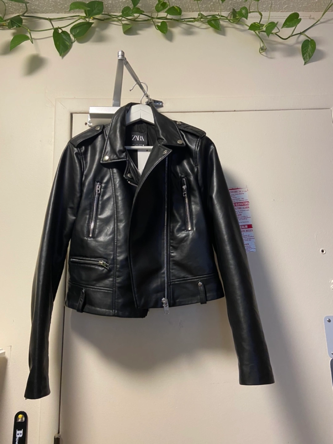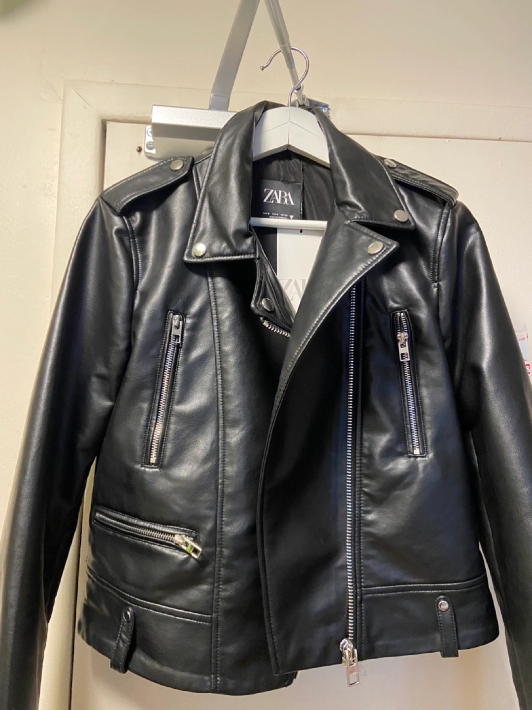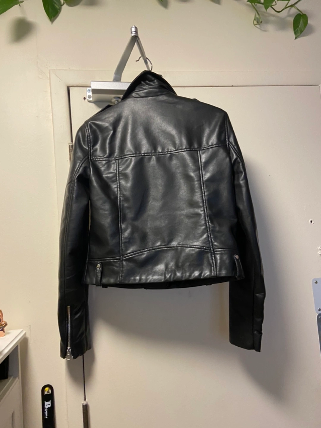 26Black faux leather biker jacket. Zipper closure. Multiple pockets. Size runs small.